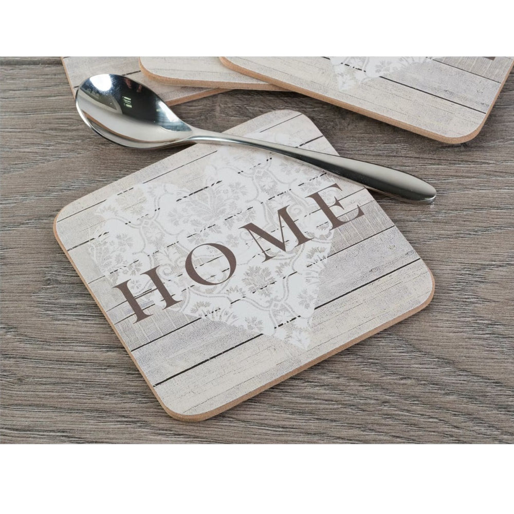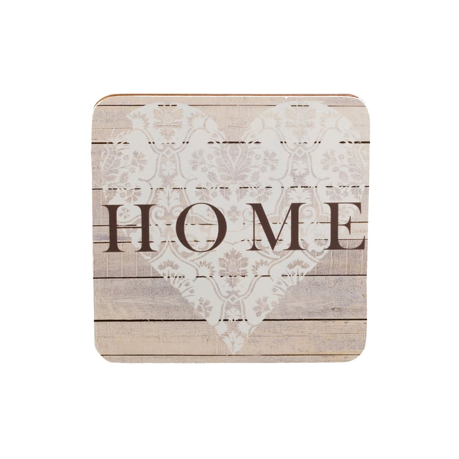 Ideal for those looking to add a cosy touch to their homes! These coasters feature a beautiful taupe design with embroidery style heart detailing and a "Home" motif statement across the middle.