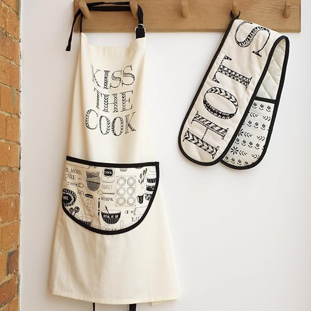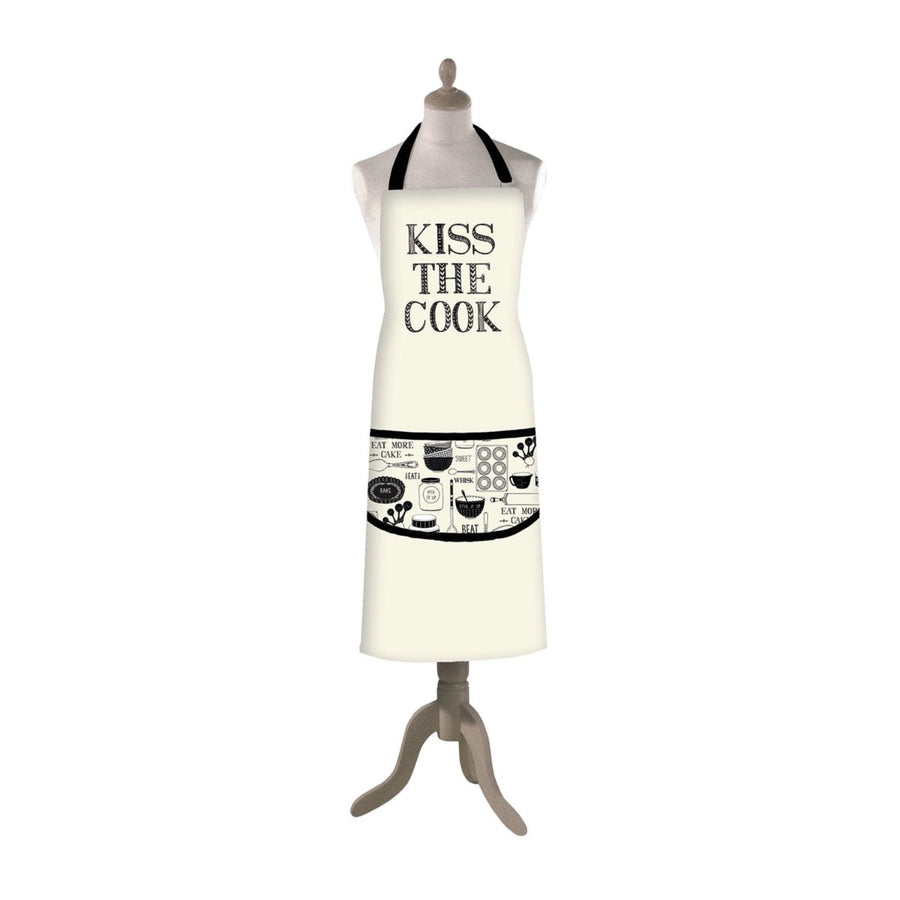 Get creative in the kitchen with this whimsical addition from Creative Tops! Featuring charming illustrations of baking utensils in a hand drawn design along with a bold "Kiss the cook" text across the top! These inscriptions are printed with a dark black colour and sit on an ivory cotton base.