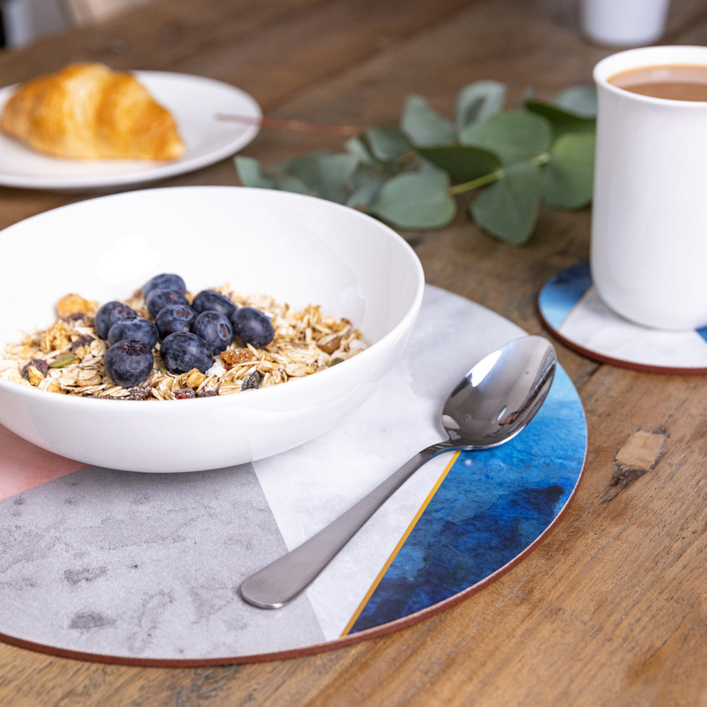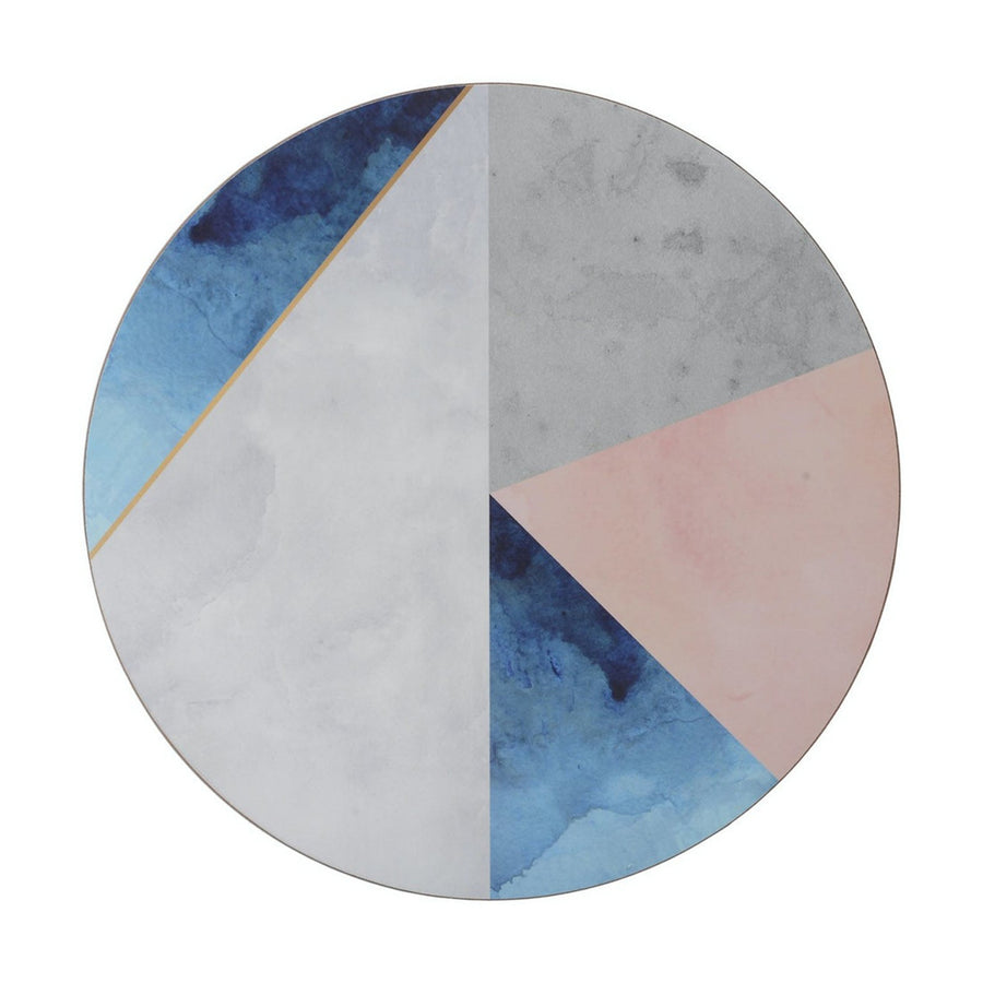 Add some artistic flair to your kitchen table with these stunning geometric palette mats from Creative Tops! Featuring soft colours of grey, pastel pink, sapphire blue and a gold lining merged with mosaic triangle prints on a circular cork background.