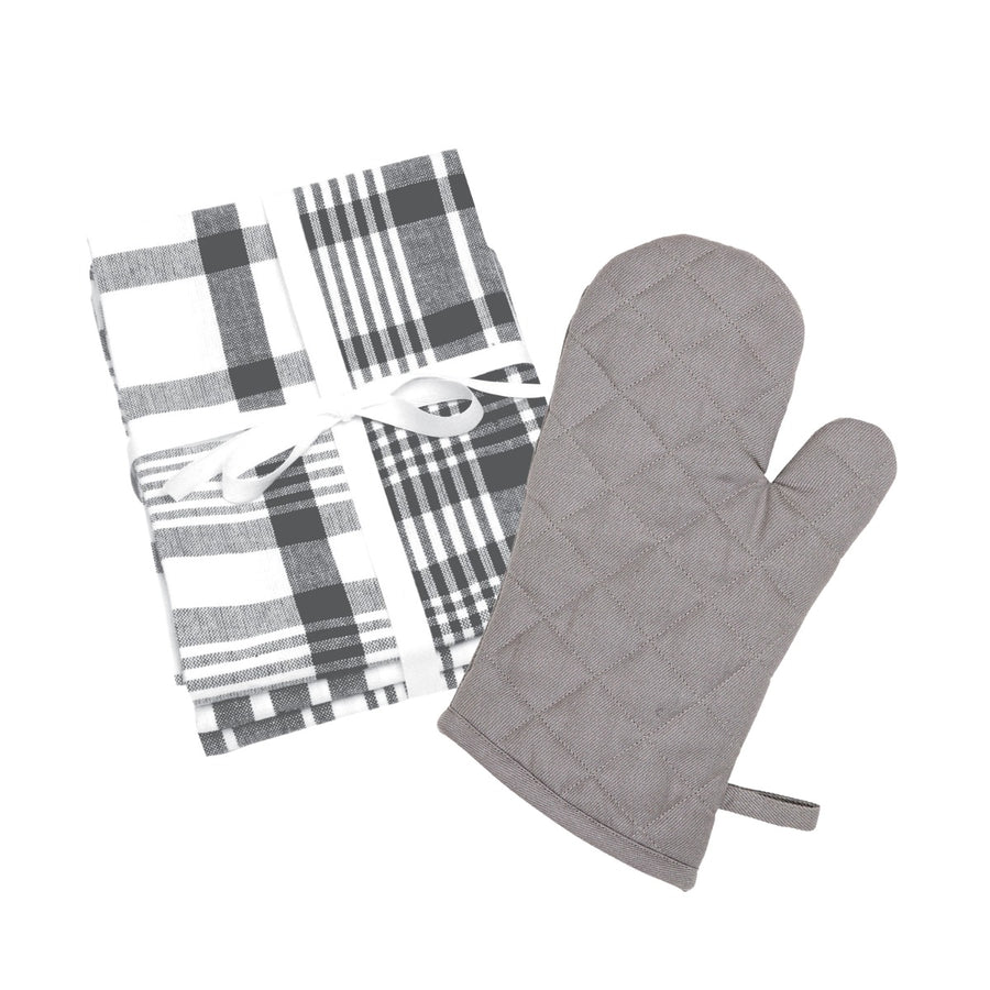 This linens set is a distinct slate grey and white colour combo, which contains an oven gauntlet glove and a set of three tea towels. The oven gauntlet has a thick polyester filling to protect your hands from hot pots and pans, and the tea towels are ideal for drying dishes and wiping up spills. Made from 100% cotton, all the items in this set are machine washable for an easy clean-up!