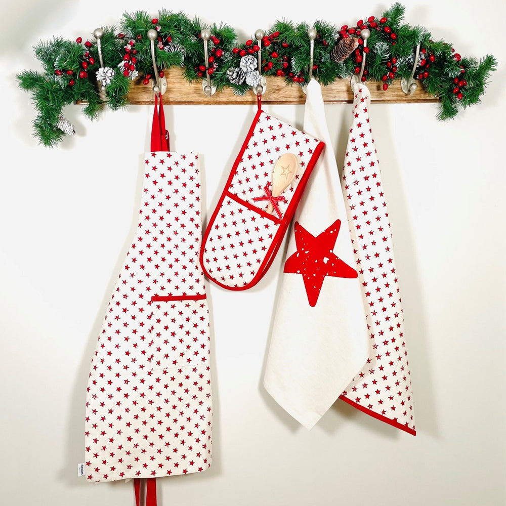 cotton apron, tea towels and oven glove set with red star pattern