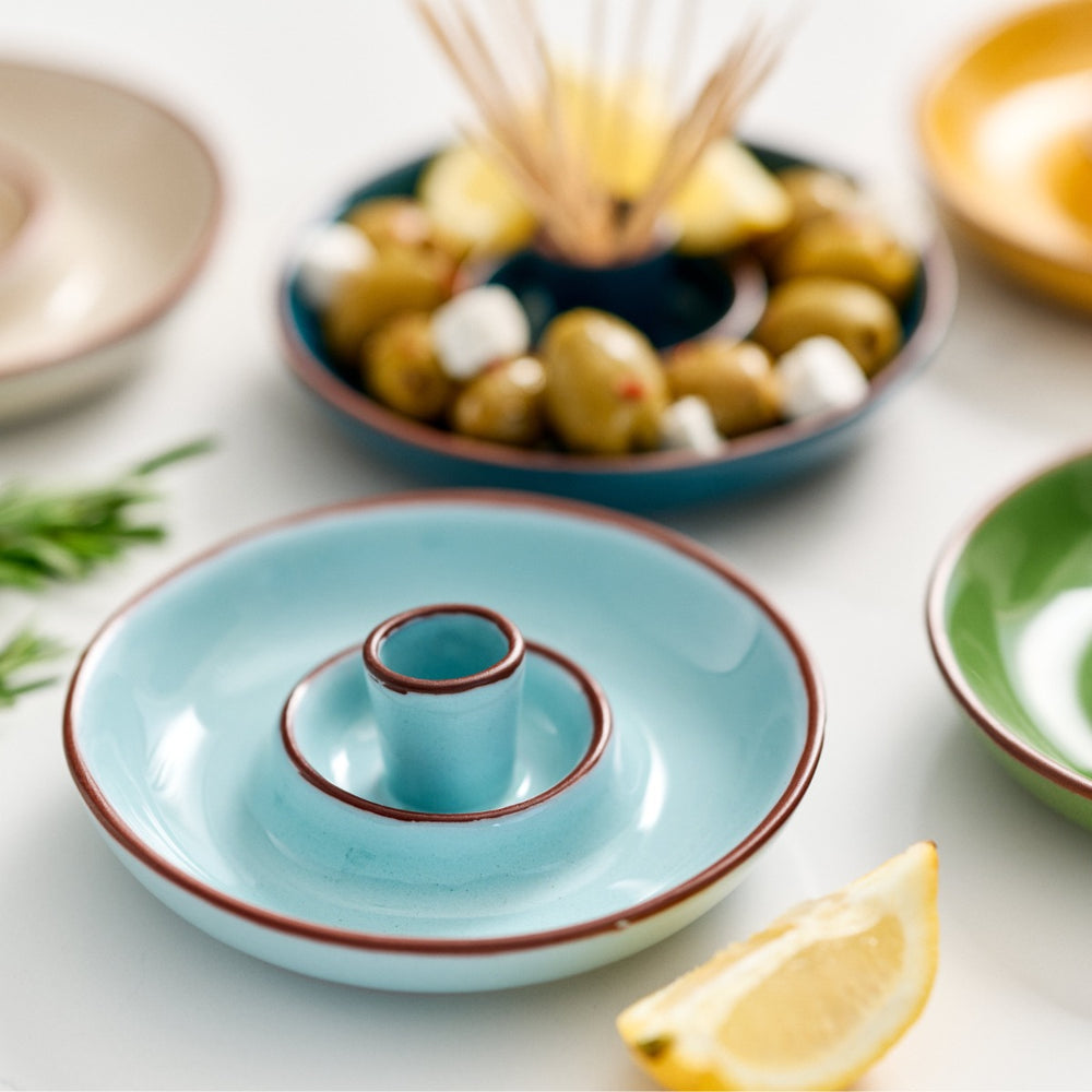 round blue terracotta dish for serving olives and tapas