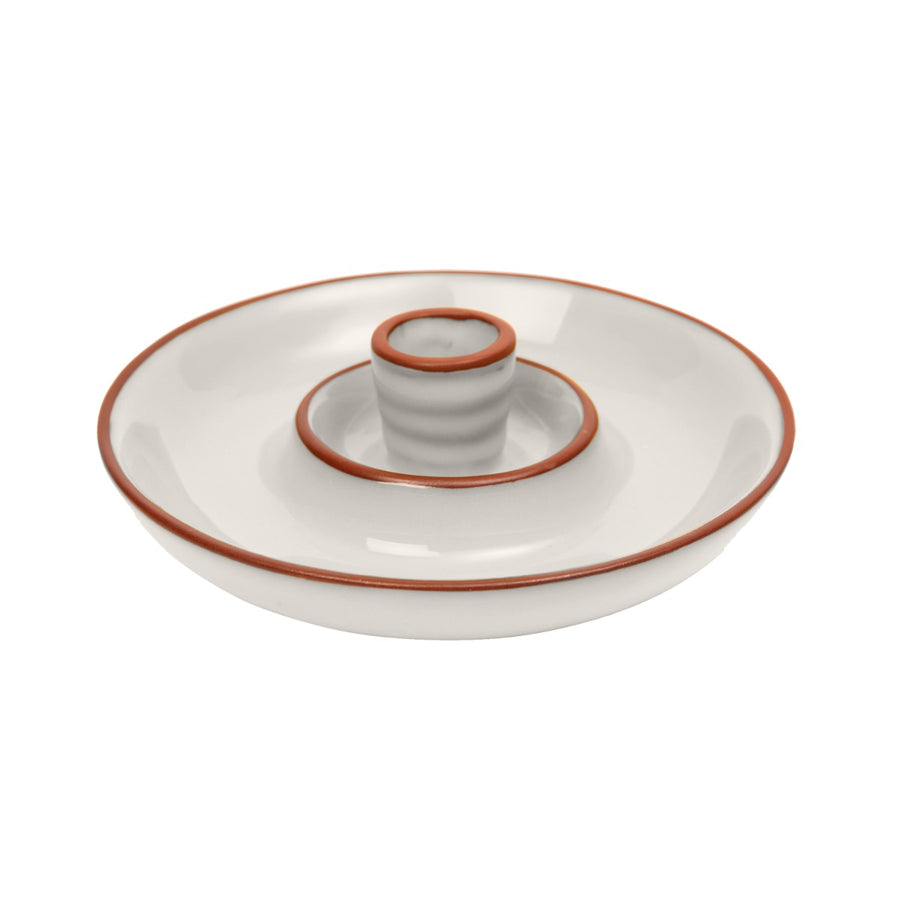a small round terracotta dish designed for serving olives, with a yellow glaze