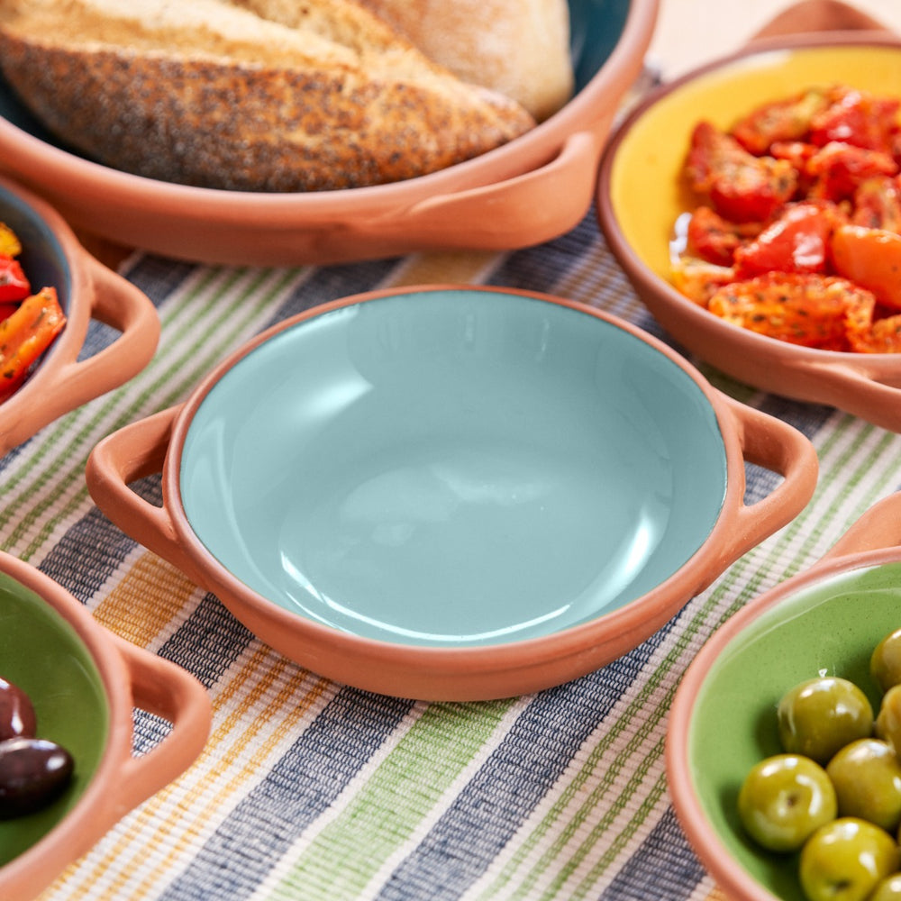 a small terracotta tapas serving dish with a duck egg blue glazed finish