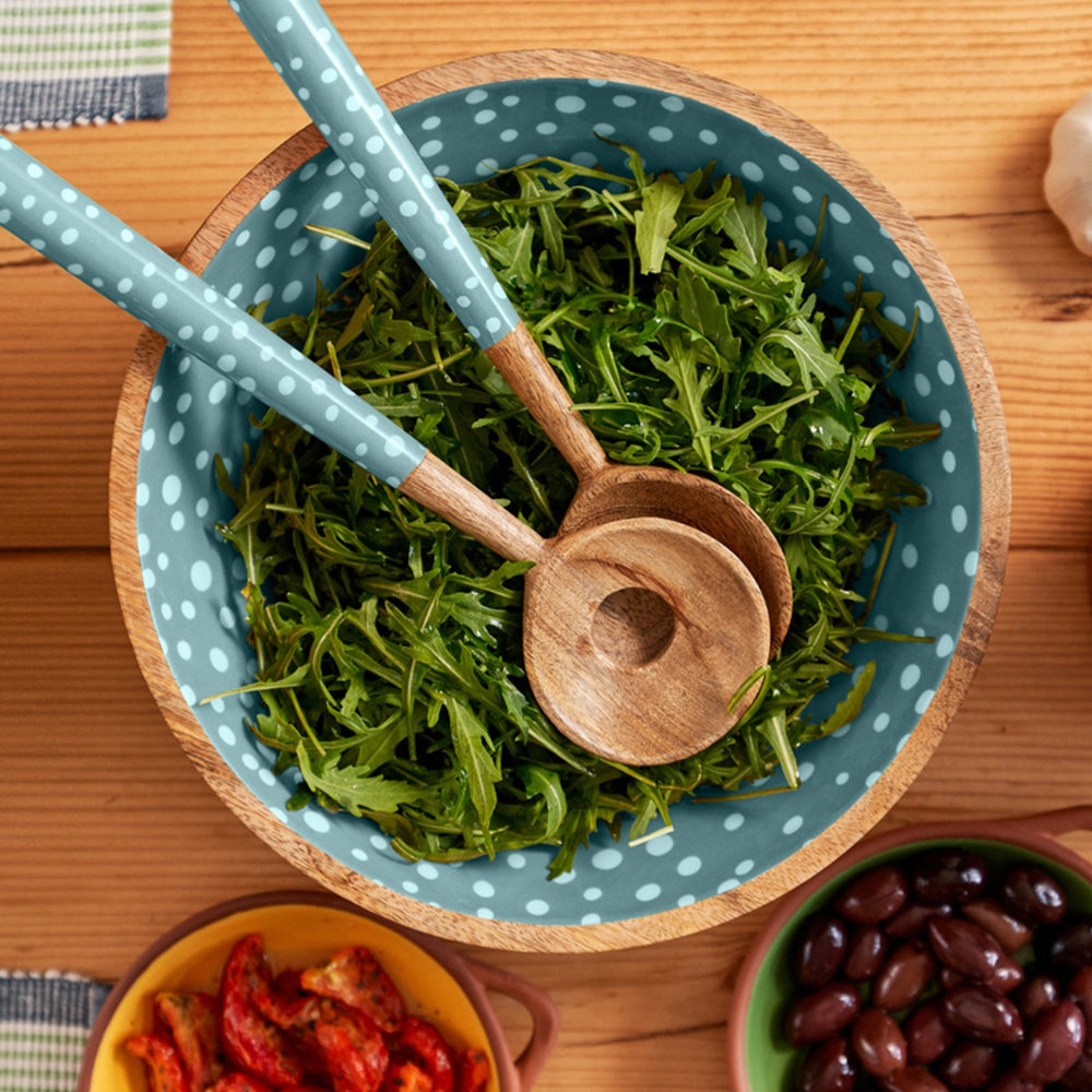 Mango wood salad servers set with enamelled handles, featuring white polka dots on a duck egg background.