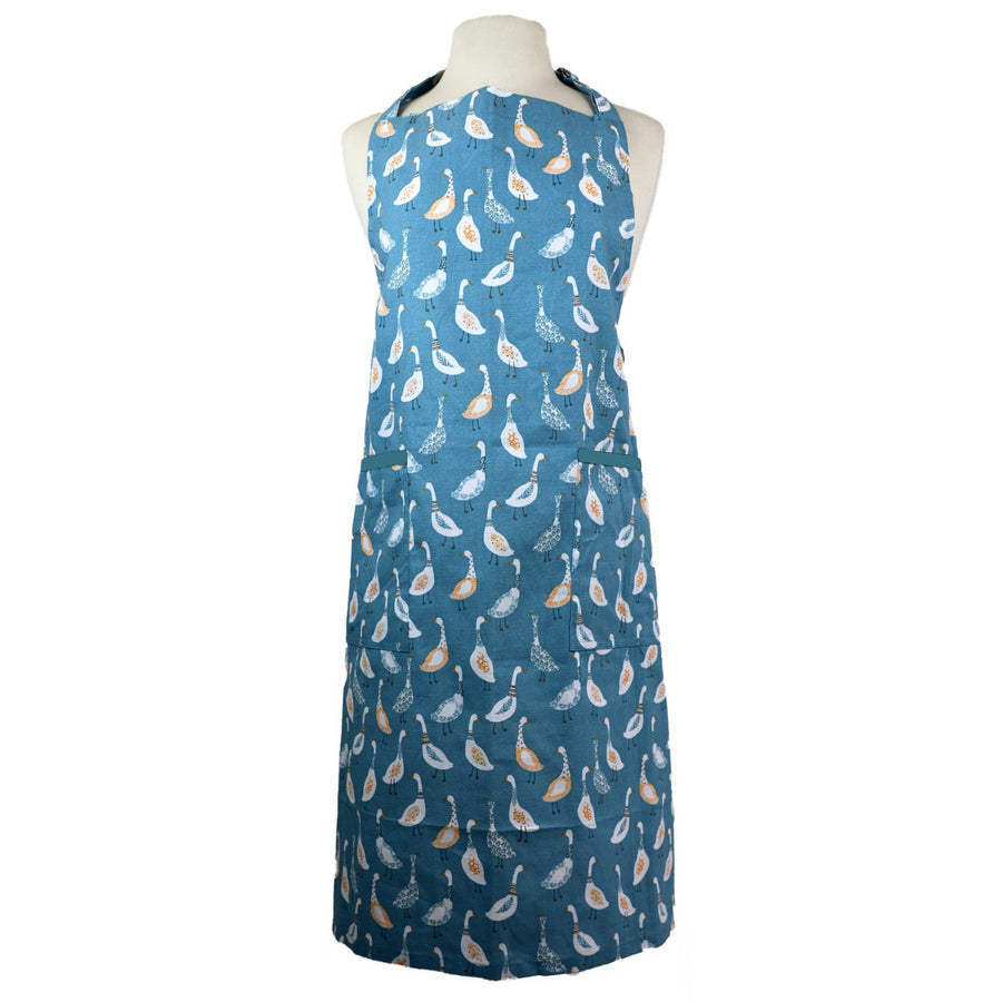Adult full-length apron made from organic cotton. Printed with various leaves, foliage and dragonflies, the kitchen accessory features a double pocket and adjustable neck strap