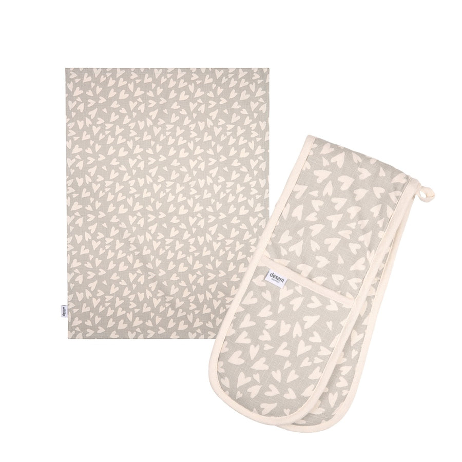 Dexam Organic Cotton Tea Towel & Double Oven Glove Set - Grey Hearts