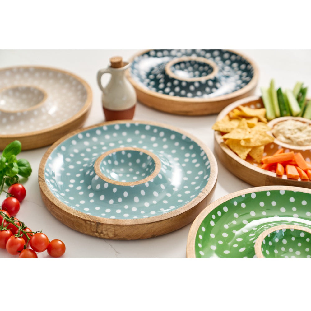 Chip and dip snacks serving bowl made from sustainably sourced mango wood with a duck egg and white polka dot patterned enamelled interior.
