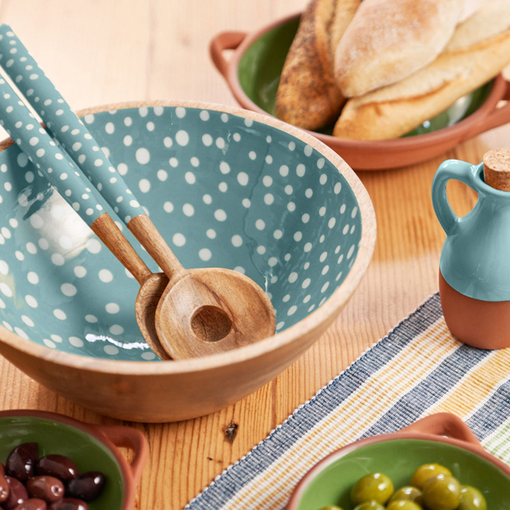 Mango wood salad serving bowl featuring a duck egg enamelled inner with white polka dots.
