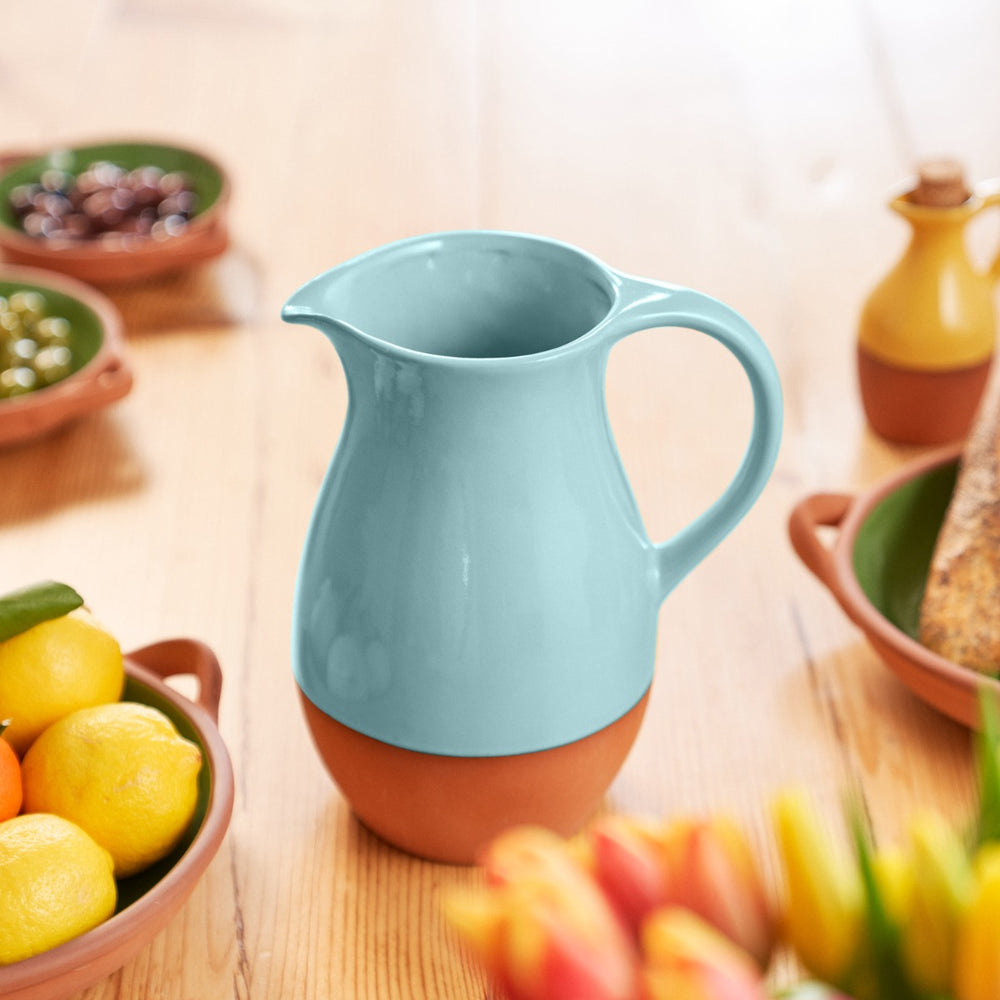 Elevate your dining experience with a touch of Mediterranean flair! This exquisite jug is made from terracotta, with an easy-pour spout to avoid spillage - perfect for serving fresh lemonade, cordial and water. Drawing inspiration from the captivating town of Sintra in Portugal, this serving jug has an enchanting duck egg blue hand-glazed finish, showcasing a seamless fusion of sustainability and elegance.