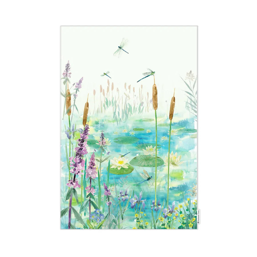 A great gift for country lovers, this organic cotton tea towel presents the beautiful rural scene of dragonflies hovering around a pond covered in lily pads, with a serene surrounding of common, colourful pond flowers and bulrush reeds. The ideal choice for drying the dishes, or simply displaying in your kitchen to add some countryside charm!