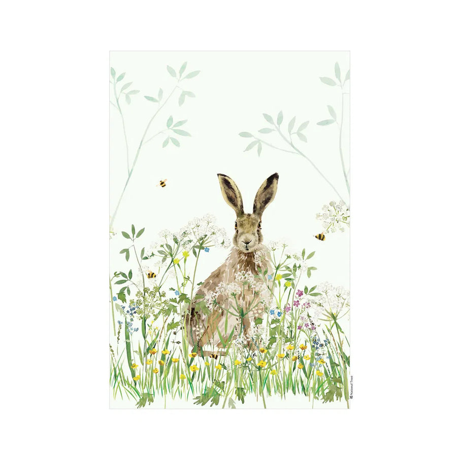 A great gift for country lovers, this organic cotton tea towel presents the beautiful rural scene of a hare paused amongst long grass, foliage and wildflowers, with bumblebees buzzing in the background. The ideal choice for drying the dishes, or simply displaying in your kitchen to add some countryside charm!