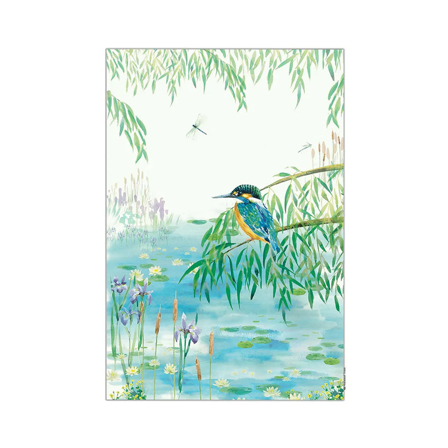 A great gift for country lovers, this organic cotton tea towel presents the beautiful rural, waterscape scene of a kingfisher perching above shimmering pond water, with a surrounding of pond flowers, hanging leaves and dragonflies swiftly flying in the background. The ideal choice for drying the dishes, or simply displaying in your kitchen to add some countryside or seaside charm!