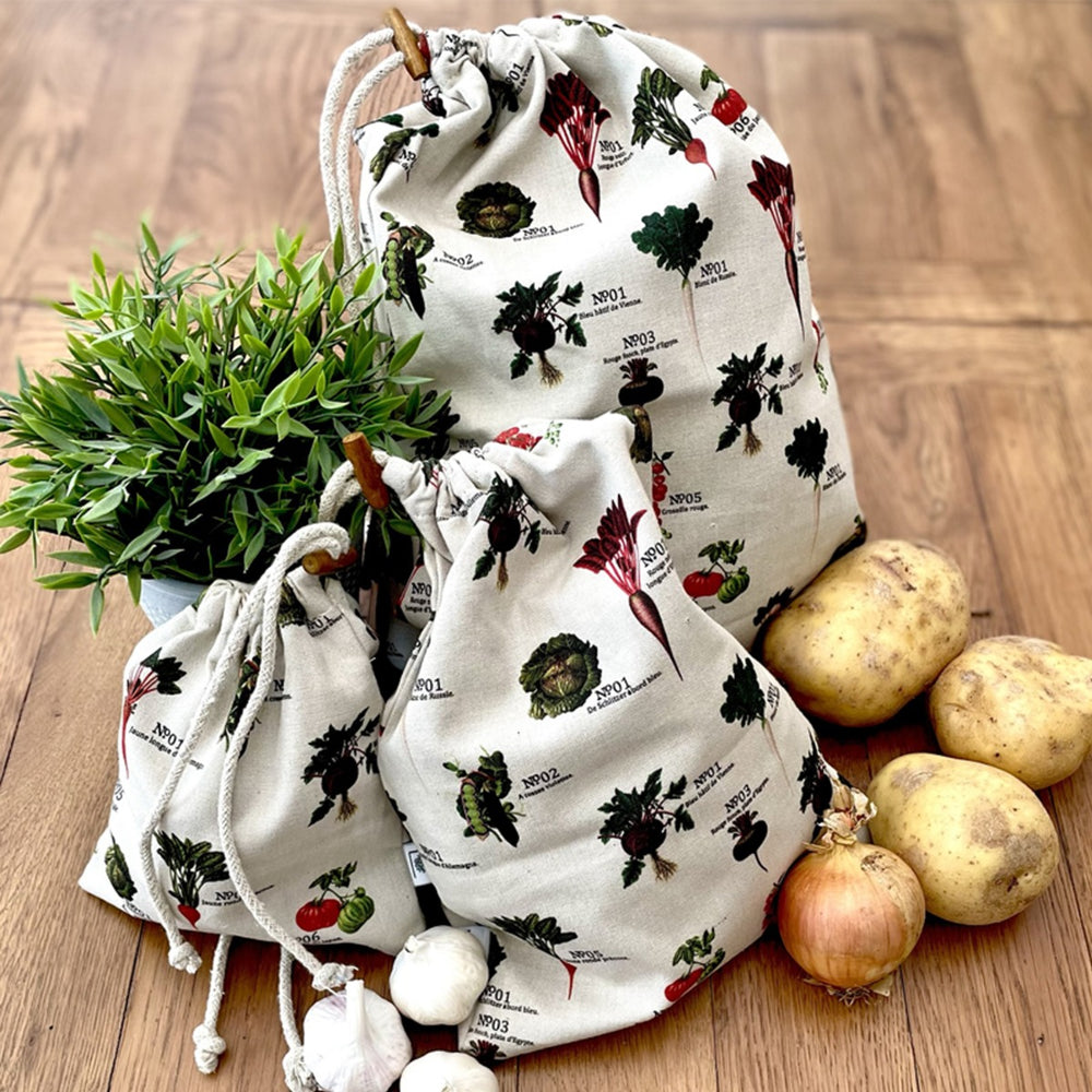 Made from 100% cotton with a moisture resistant liner, you can safely store your potatoes, onions, garlic and other root vegetables. Also perfect for taking to your local green grocers when shopping! Provided as a set of three, in different sizes for convenience.
