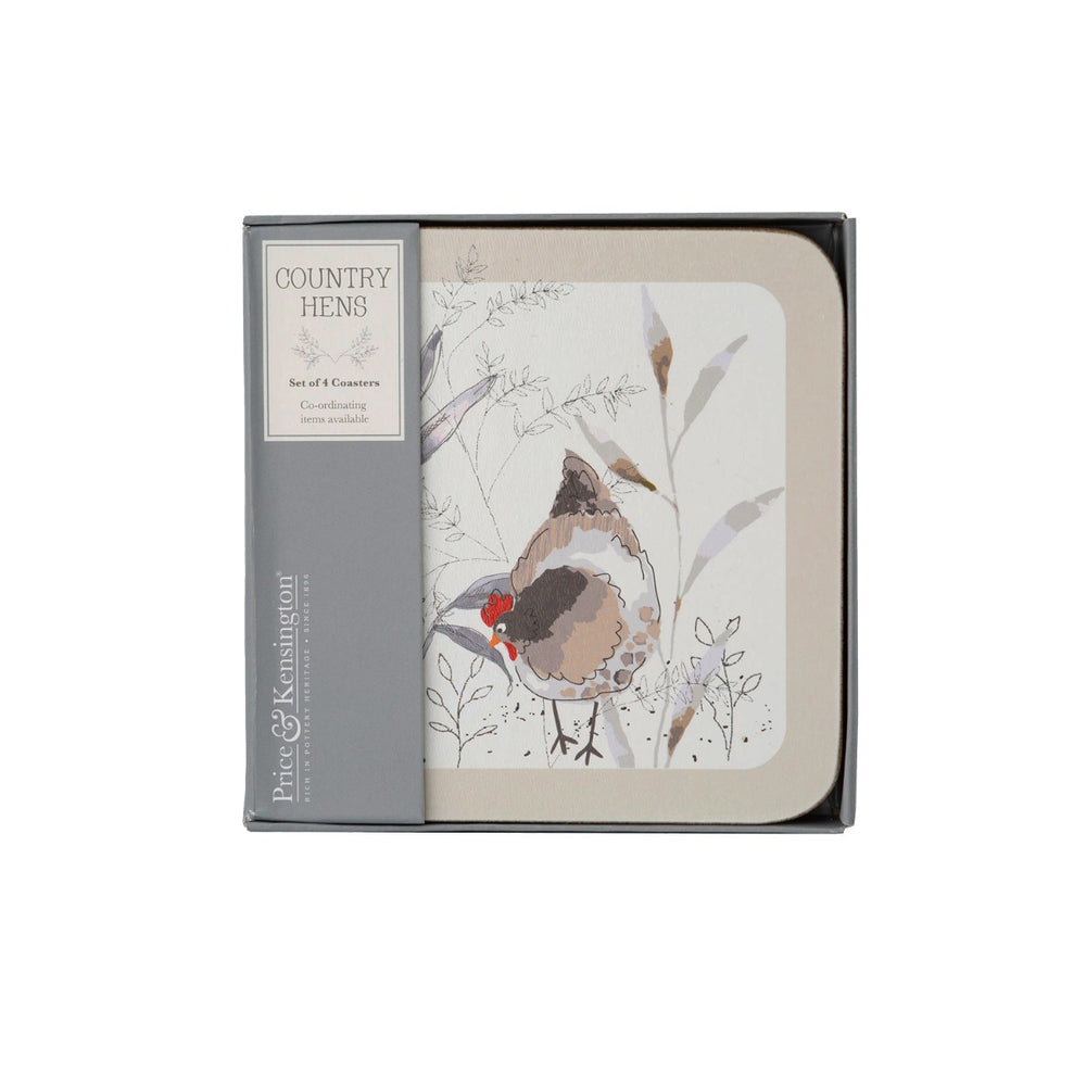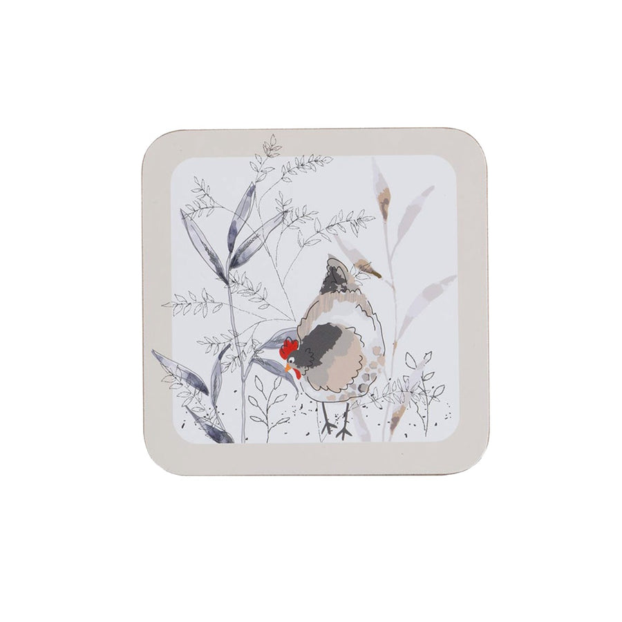 This rustic coaster set is perfect for any relaxed country dining scheme. Featuring charming hens scattered through some natural foliage, it truly captures the daily life "out in the open fields".