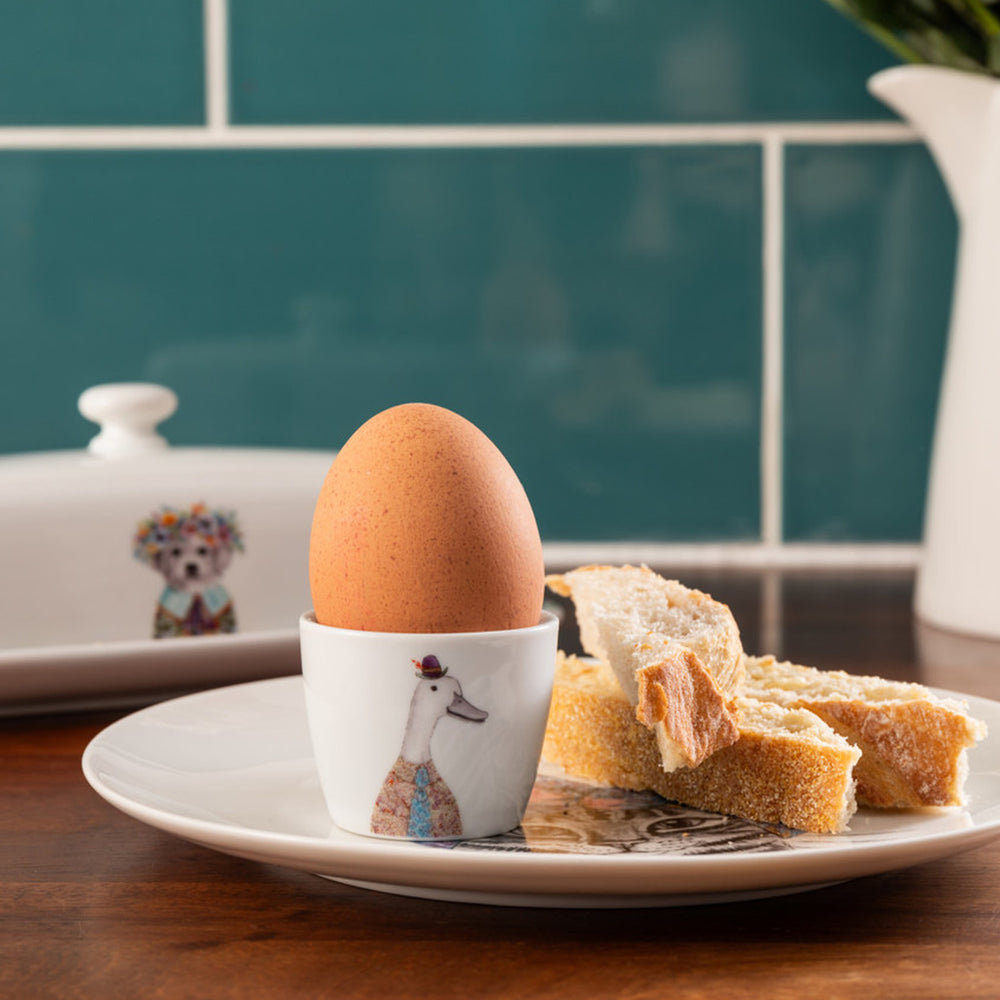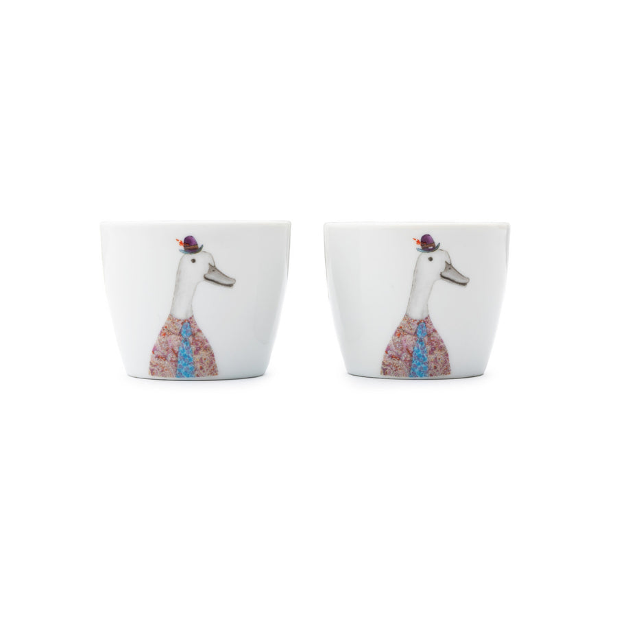 Add an adorable yet playful touch to your breakfast table with this sweet set of two porcelain egg cups! Each featuring a charming duck design on both sides, wearing a hat with a smart shirt and tie, these egg cups are ideal for animal lovers and collectors alike.