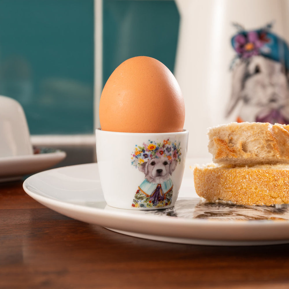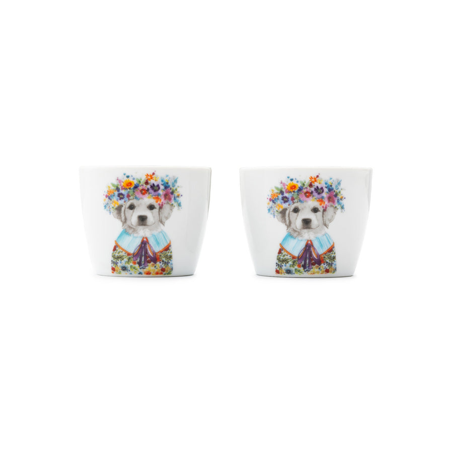 Add an adorable yet playful touch to your breakfast table with this sweet set of two porcelain egg cups! Each featuring an endearing puppy design on both sides, with a floral crown upon their head, these egg cups are ideal for animal lovers and collectors alike.