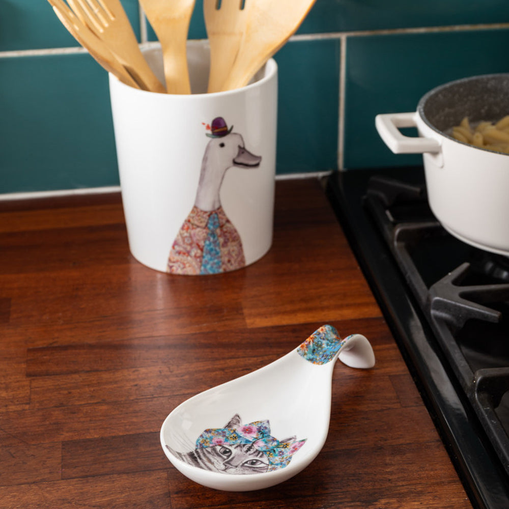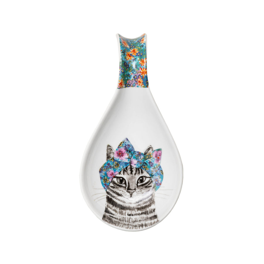 The ultimate way to bring some quirkiness and colour to your kitchen! Featuring a delightful design displaying a cat with a floral bandana tied in a bow on it's head, this durable porcelain spoon rest will not only help keep your kitchen tidy, but will also prevent drips and stains across your countertops.