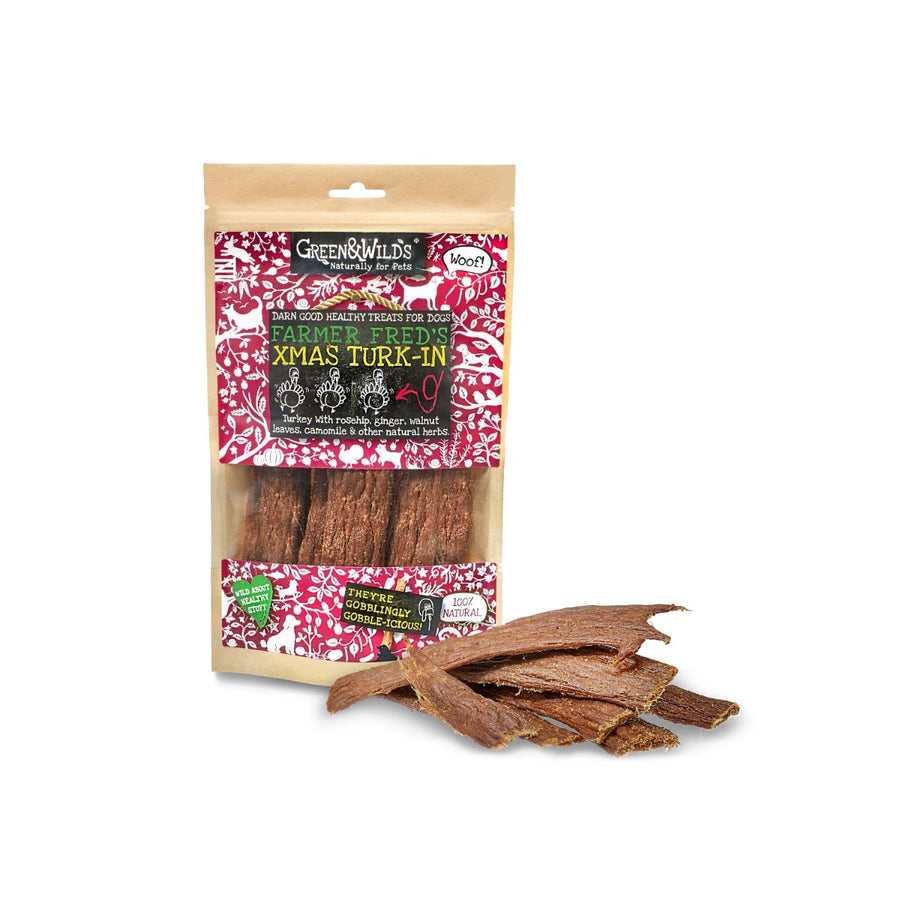 These Green & Wilds Farmer Fred's Xmas Turk-in chews are a healthy, natural choice for your dog! Made from 96% turkey and 4% herbs, these chews are great for dogs with sensitive tummies - and contain no harmful additives. These chews are 100% natural and are gluten and lactose free, which means they are great at keeping intestinal flora healthy, and also keeping nasty intestinal parasites at bay! What's more, these chews can be easily broken into smaller pieces for training purposes, or for smaller dogs.