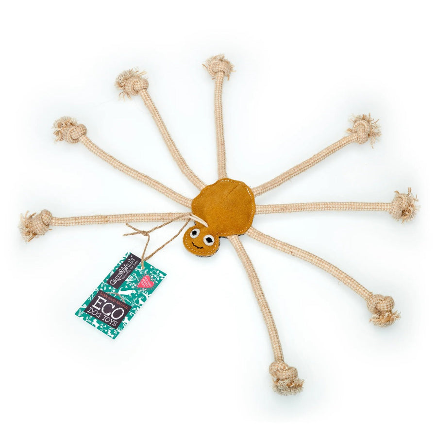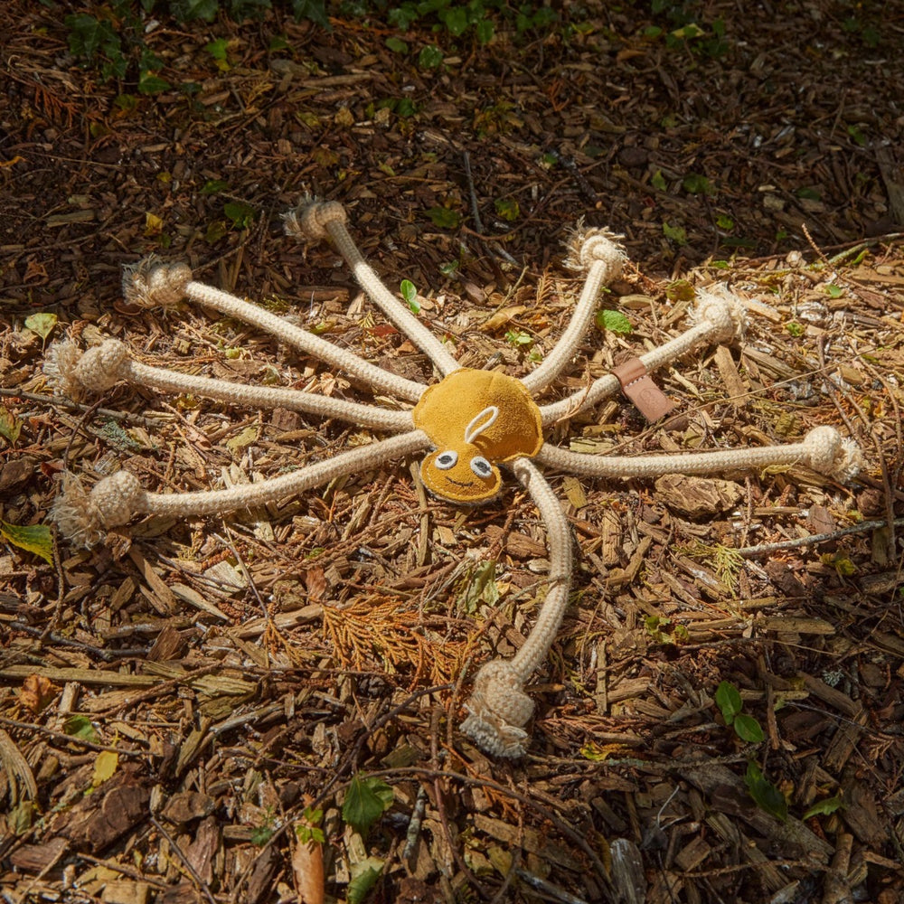 This loveable, spider-shaped toy is the most perfect eco-friendly friend for your dog. Made from a suede outer with natural jute fibre stuffing and rope additions, your pet is bound to have hours of fun and can even snuggle up to her at night. Jute is a natural plant fibre.