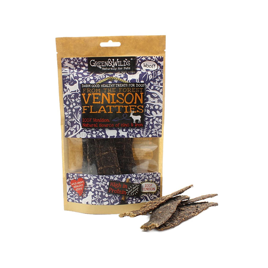 These Green & Wilds 'Venison Flatties' 100% natural dog chews are perfect for providing your dog with a satisfying tasty treat full of goodness which has a high nutritional value. These chews are super high in protein, and a good source of zinc, iron & omega 3. As they are made from 100% Venison meat, these treats are also great for dogs with sensitive stomachs, and they help support a healthy immune system and organ function. What's more, these chews can be easily broken into smaller pieces for training purposes, or for smaller dogs.