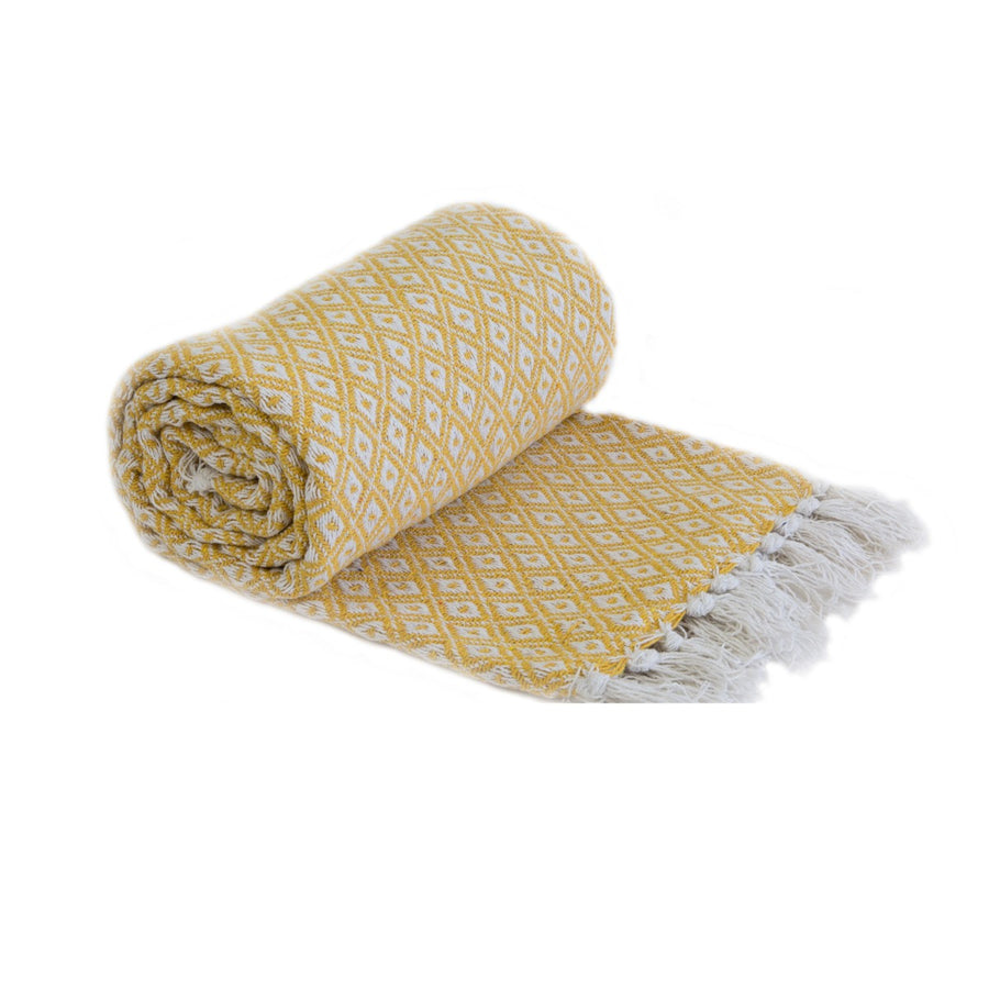 Featuring a stylish diamond pattern, this soft, recycled cotton weave throw is the perfect accessory to your home. With complementing tassels, this ochre coloured blanket will add brightness and texture to any room in your home.