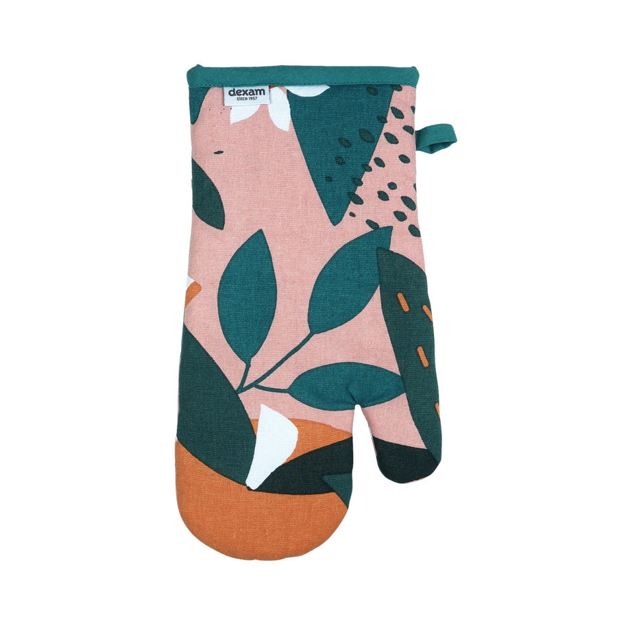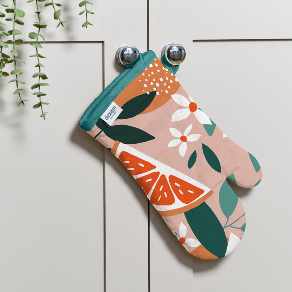 Stay sustainable and fashionable in the kitchen with this fun oven glove, not only a feast for the eyes but also a conscious choice for the planet. Crafted from 100% premium recycled cotton and polyester, this single oven gauntlet showcases a bold exotic fruit print on a delightful pink base. A lovely way to add a pop of colour to any kitchen!