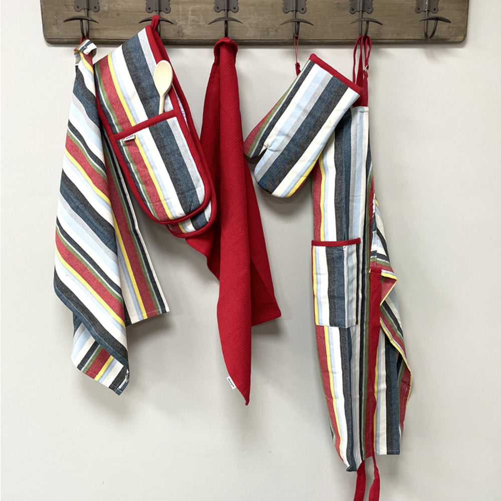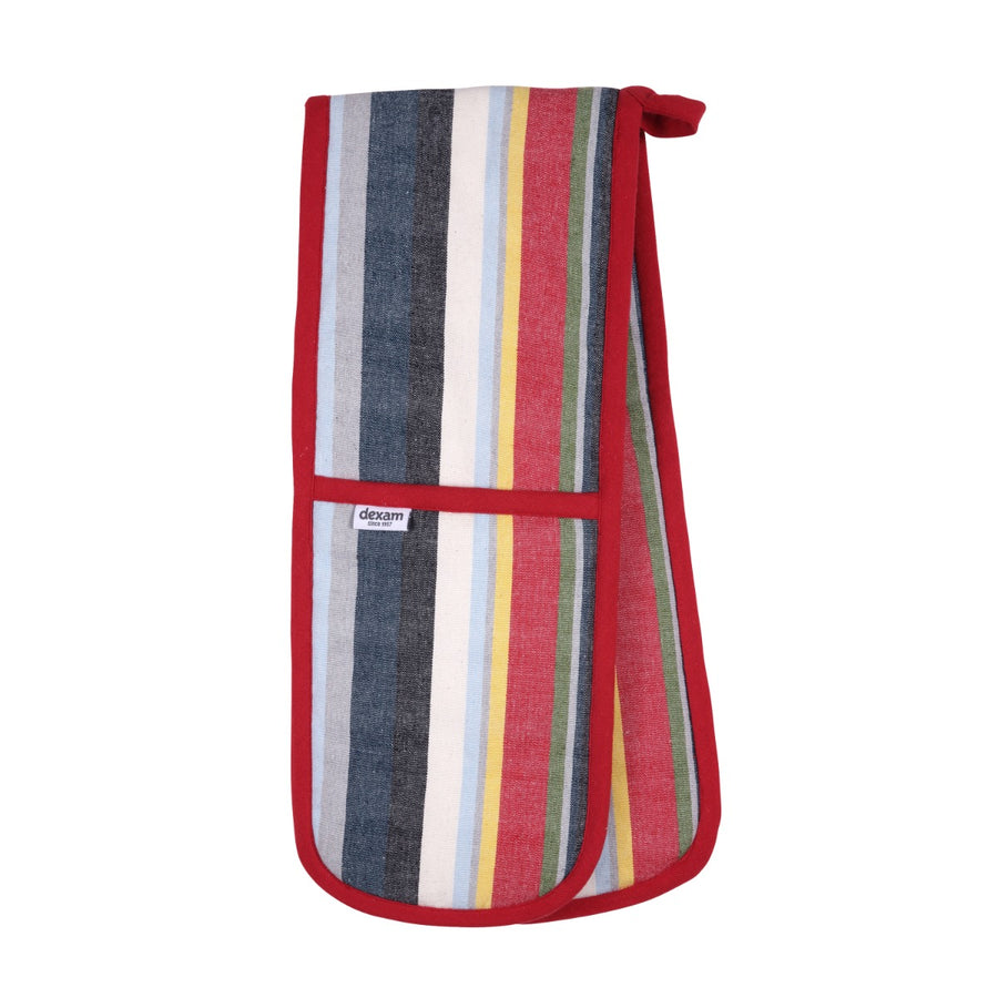 Stay sustainable and fashionable in the kitchen with this vibrant oven glove, not only a feast for the eyes but also a conscious choice for the planet! Crafted from 60% premium recycled cotton, this double oven glove showcases a captivating blend of colours in its striped design.