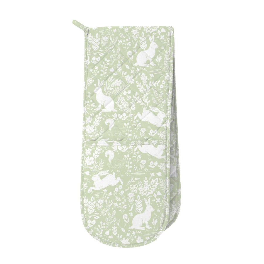 Featuring an intricate pattern of flora, fauna, and animals on a calming, natural sage green background, this stunning double oven glove is perfect for adding a touch of elegance and charm to your kitchen while providing practicality and functionality.