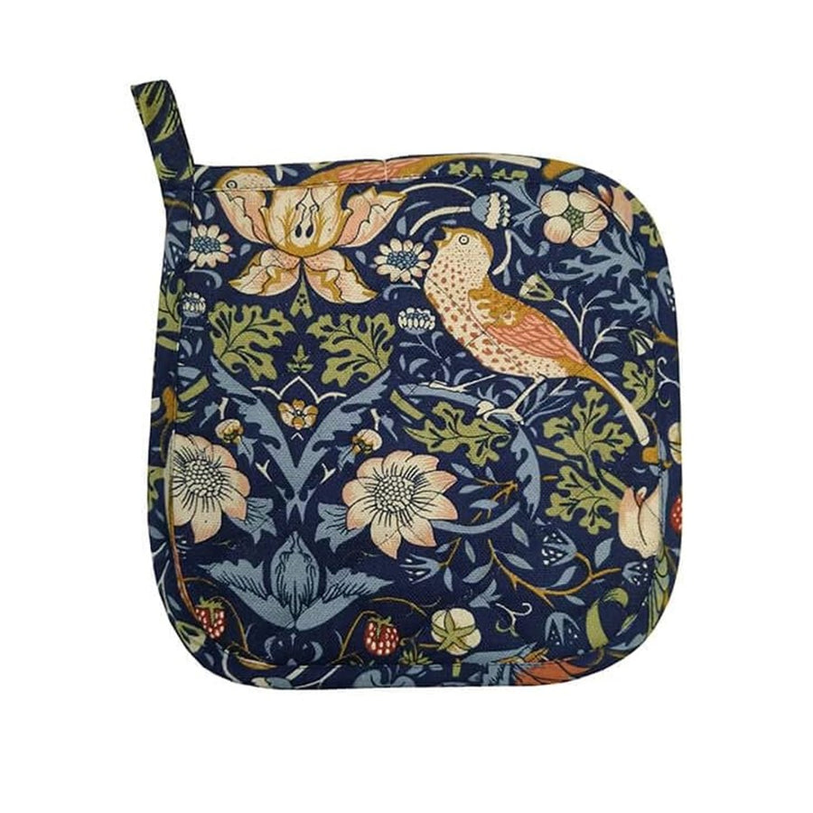 This high-quality pot holder features the timeless Strawberry Thief design, from the William Morris collection, on a navy blue background. The 100% cotton fabric and polyester padding will protect you from burns while cooking while bringing a beautiful, on-trend touch to your kitchen. Brighten up your space functionally with William Morris.