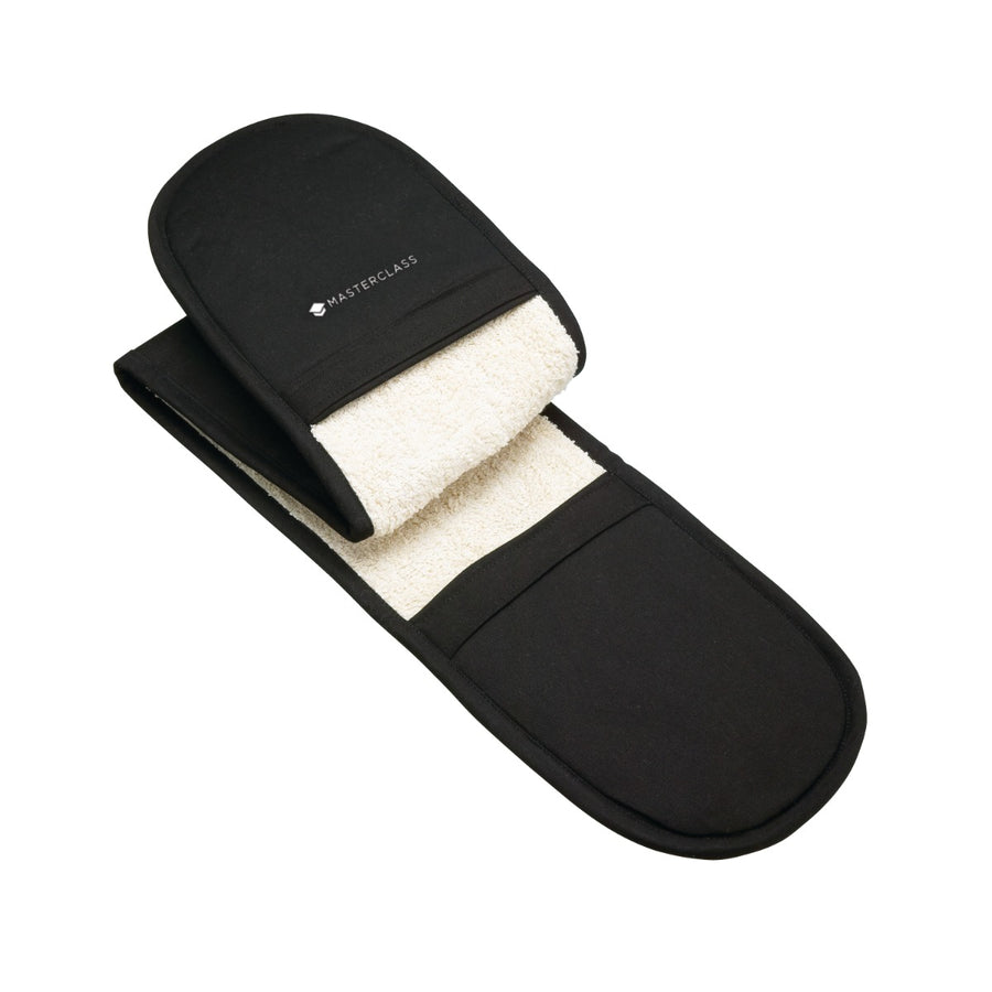 A high performance oven glove you can trust! This black double oven glove from the MasterClass range is specially designed for ultimate protection & comfort when handling hot pans. With a 100% cotton towelled interior and extra thick padding, and an integrated steam barrier. Machine washable when required, this double glove will allow you to have a strong, safe grip on any item.
