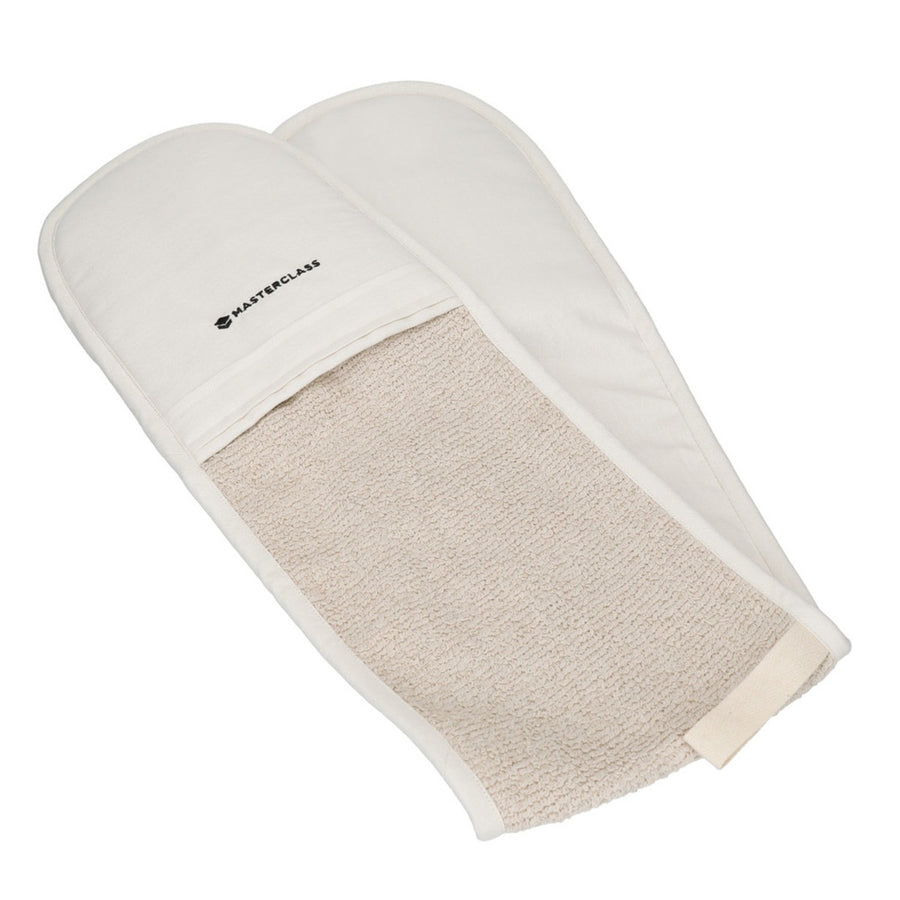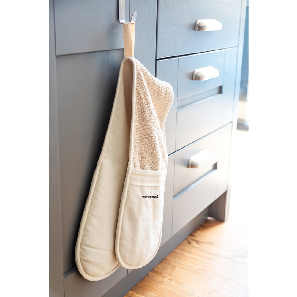 A high performance oven glove you can trust! This classy-looking cream double oven glove from the MasterClass range is specially designed for ultimate protection & comfort when handling hot pans. With a 100% cotton towelled interior and extra thick padding, and an extra nylon layer to provide further insulation against heat. Machine washable when required, this double glove will allow you to have a strong, safe grip on any item.