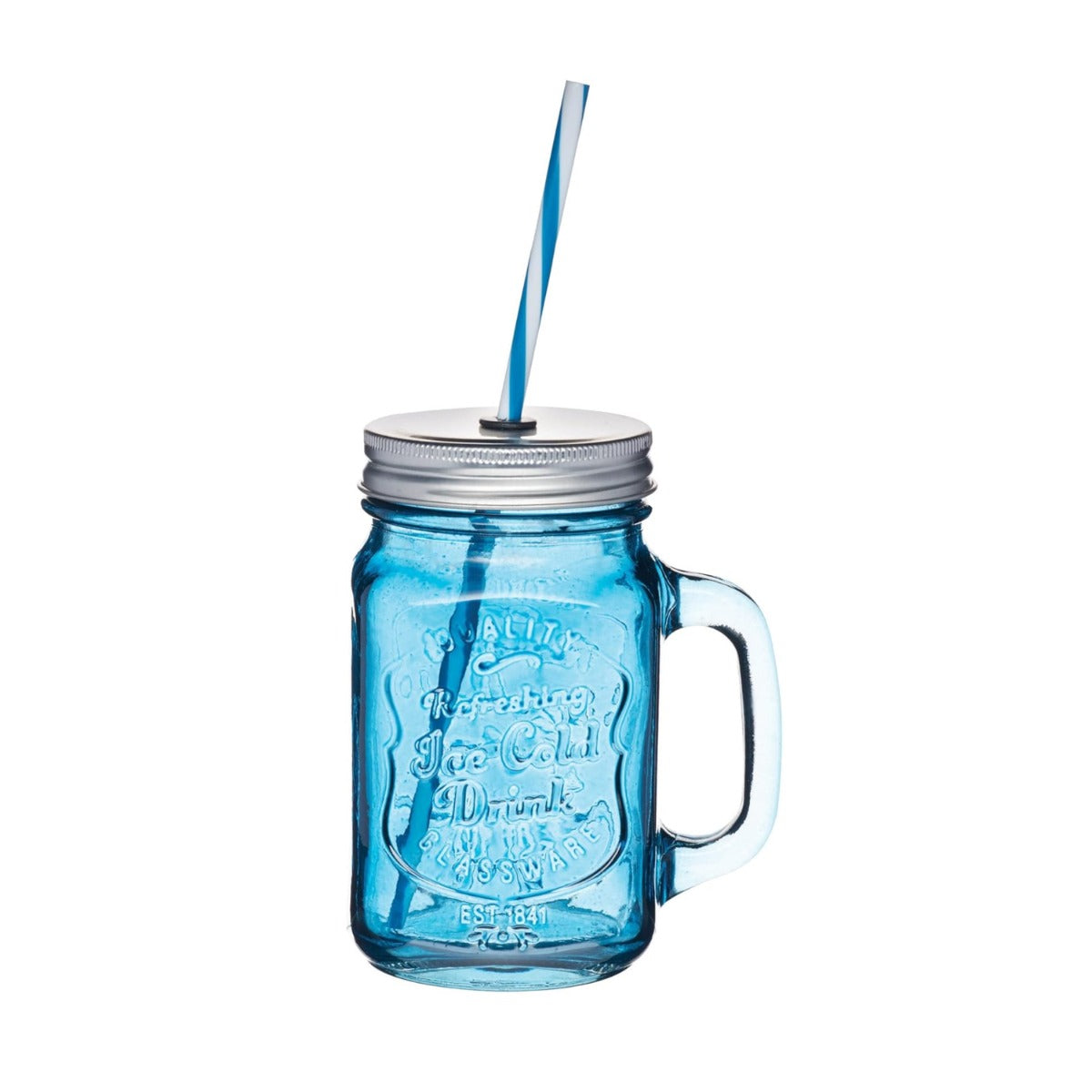 KitchenCraft Coloured Glass Drinks Mason Jar with Straw - Blue