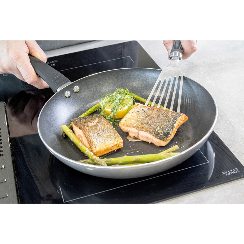 Frying pans with water-based hydrolon non-stick coating, available in a small, medium or large sizing.