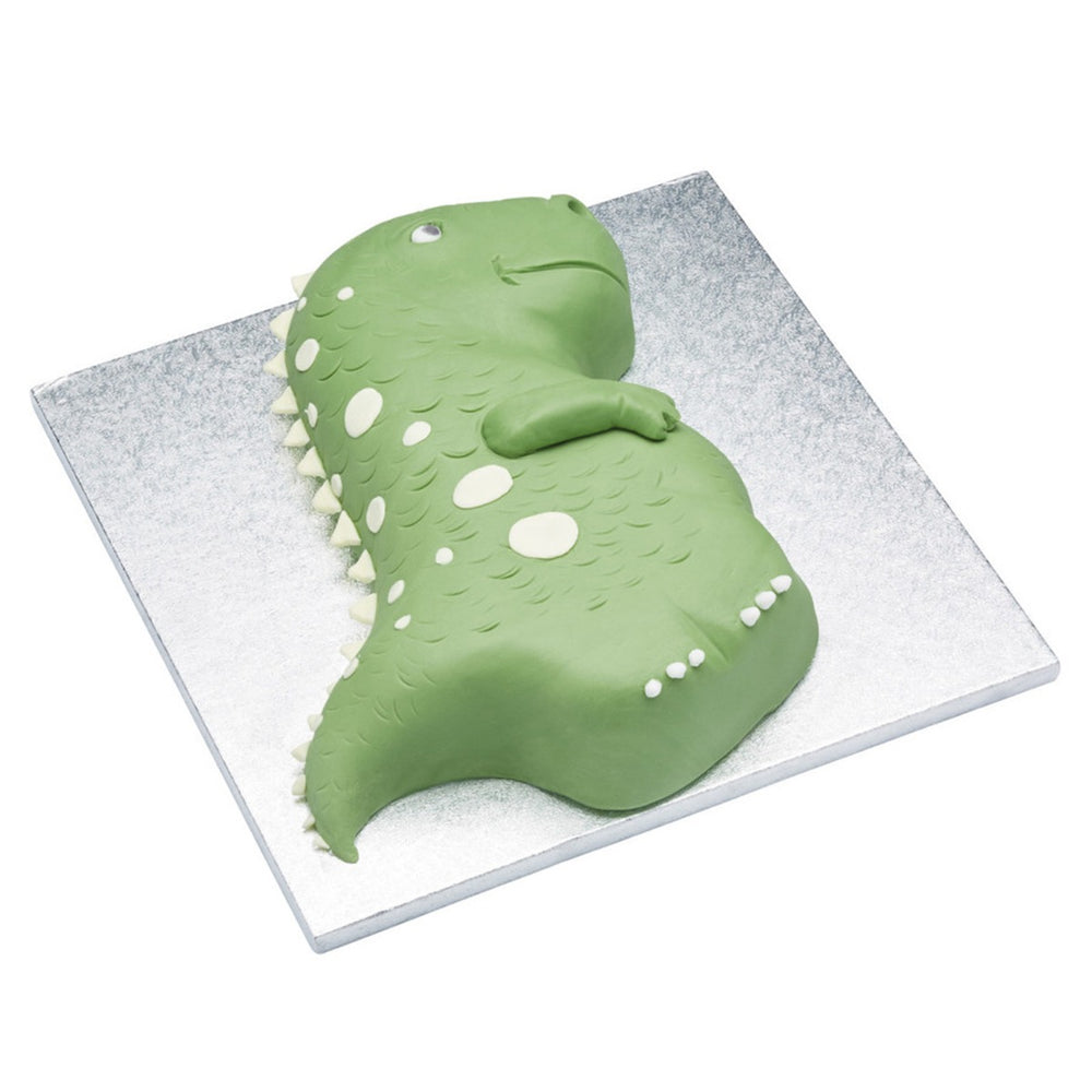 Dinosaur shaped cake pan made from silver anodised aluminium.