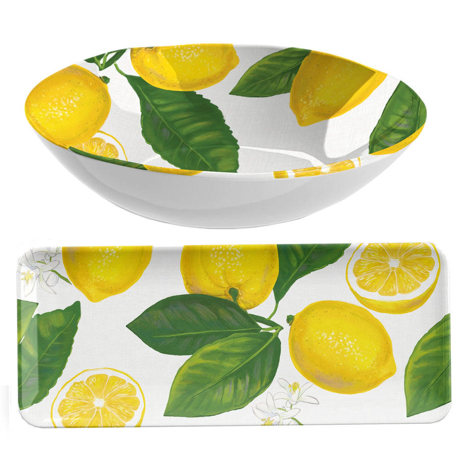 Help make your summer dining and garden parties extra special with our fruity lemon melamine appetiser serving tray and salad bowl set. Ideal for serving nibbles/snacks and a sharing salad or pasta dish, this eye-catching lemon print serveware set is perfect for outdoor and indoor use.
