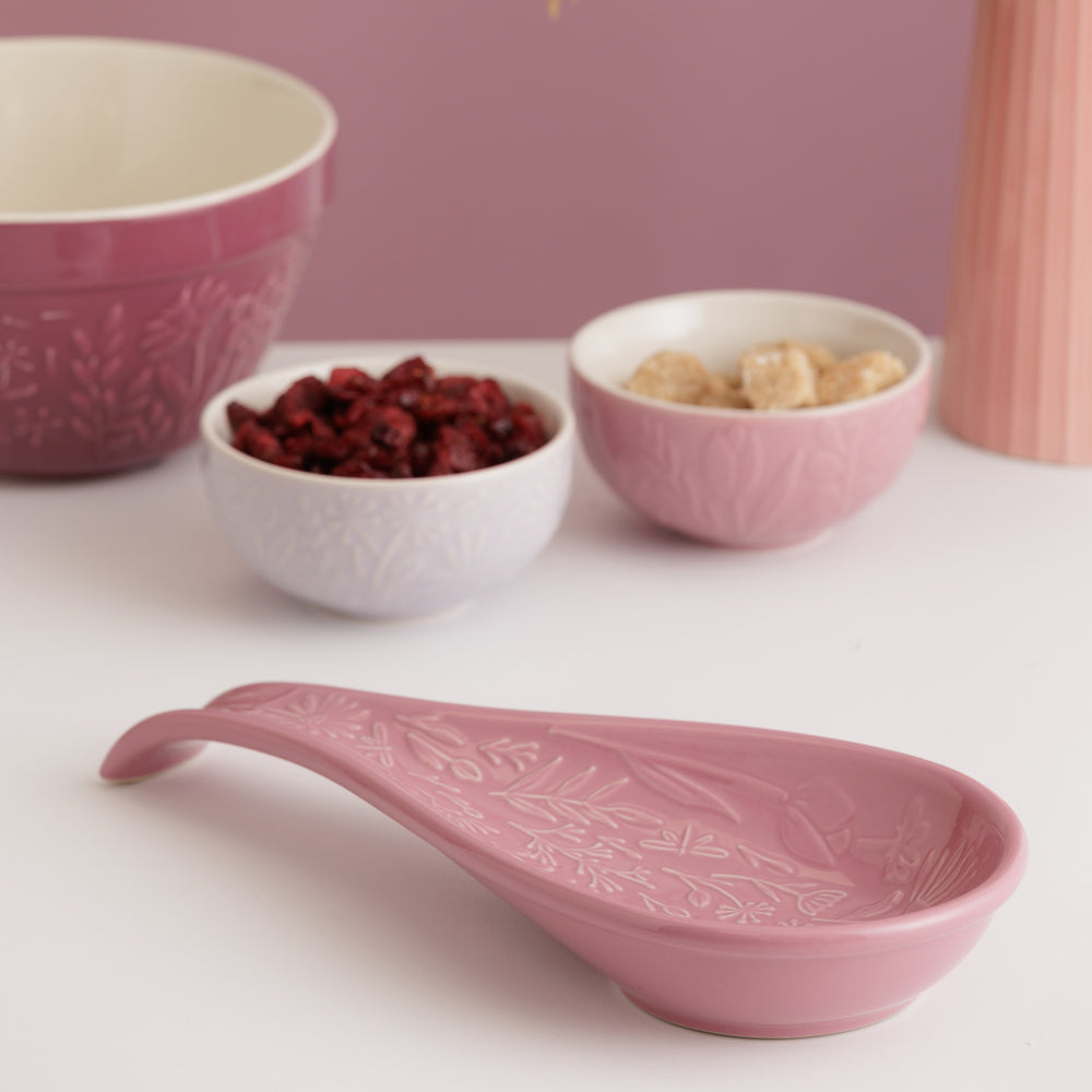large stoneware mixing bowl in lilac purple with an embossed floral print