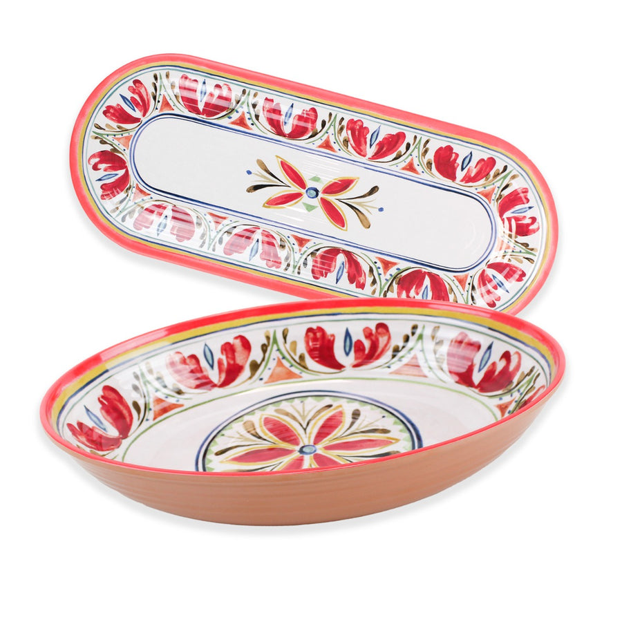 Bring a touch of those Mediterranean vibes with you wherever you go with this rustic styled oval serving bowl and oval tray set. Featuring patterns bold enough to give you warmth and comfort, yet nostalgic memories of days gone by, this serving set is perfect for displaying a selection of tapas, salads or even sweet treats and desserts!