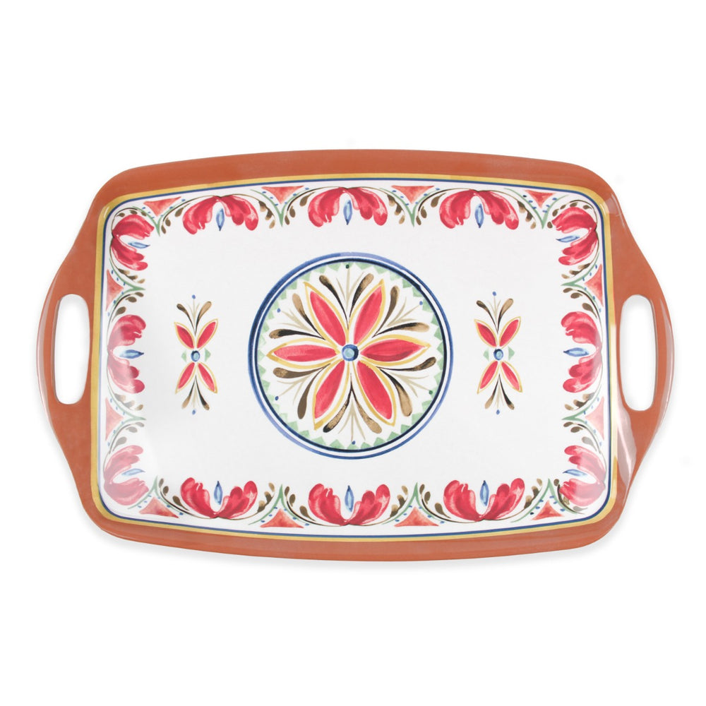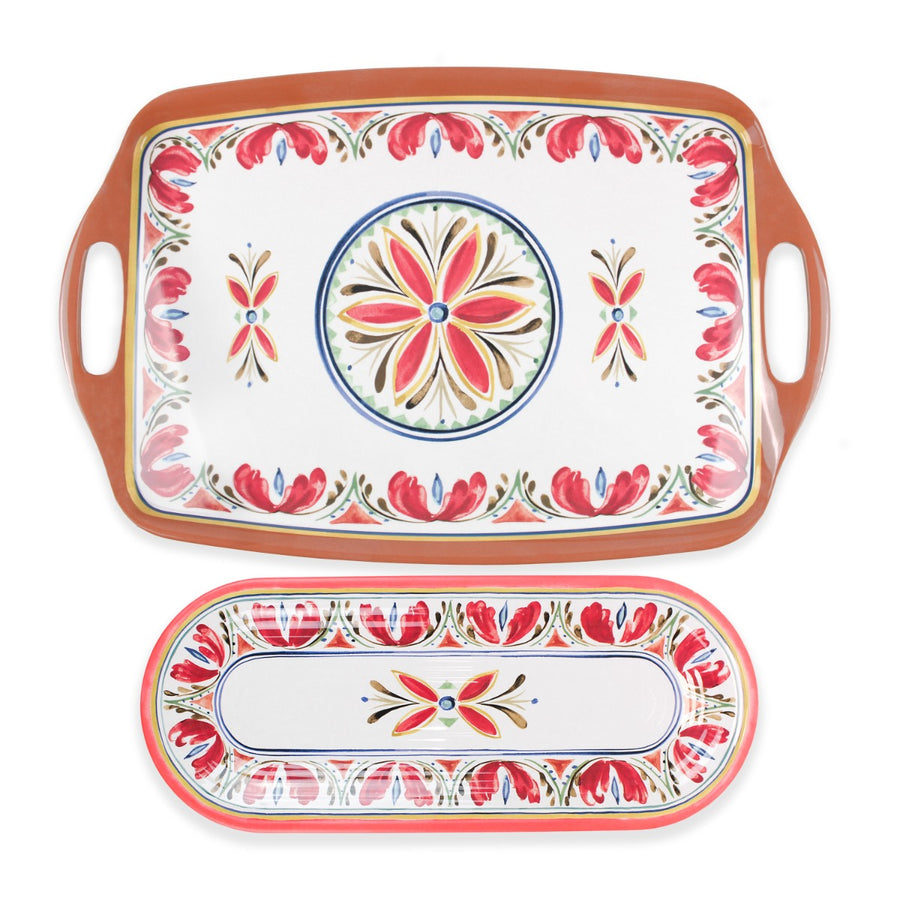 Bring a touch of those Mediterranean vibes with you wherever you go with this rustic styled outdoor dining set. Containing a handled tray and an oval appetiser platter, this set features patterns bold enough to give you warmth and comfort, yet nostalgic memories of days gone by - perfect for creating a colourful and delicious summer's feast! Ideal for serving delicious nibbles and carrying drinks.