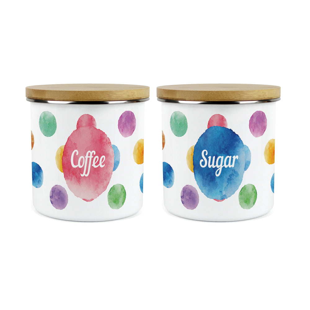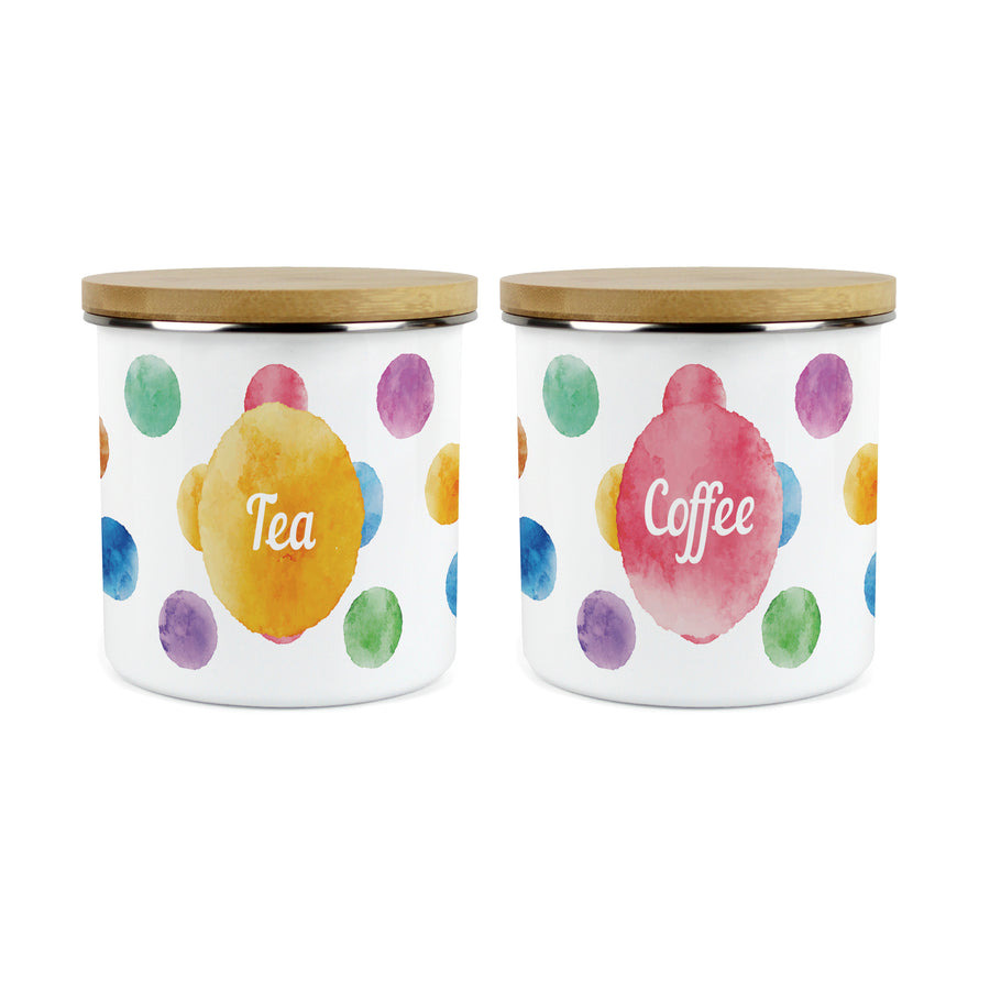 Bring the joy of a rainbow into your home with this duo of polka dot patterned enamel storage canisters! Available in two sizes, this multicoloured set of sturdy canisters is perfect for adding a fun pop of colour to any kitchen, and would make a lovely housewarming gift or a pretty, practical addition to your own home!