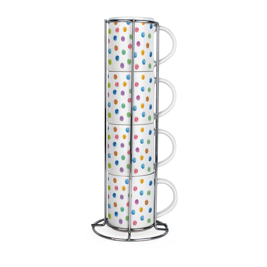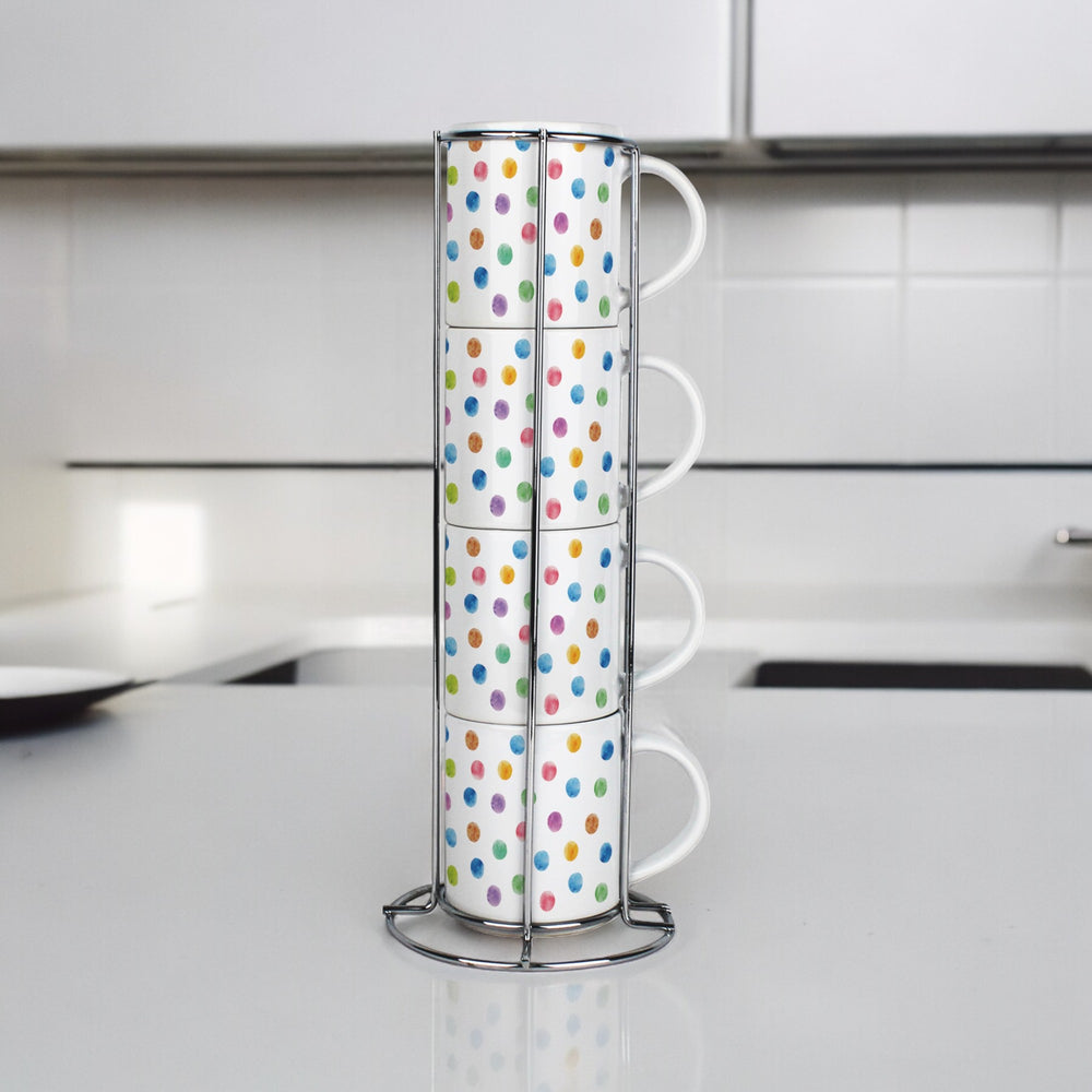 Bring the joy of a rainbow into your home with this set of four spotty stacking mugs! Perfect for adding a fun pop of colour to any kitchen, these multicoloured polka dot patterned cups would make a lovely housewarming gift or pretty, practical additions to your own home!