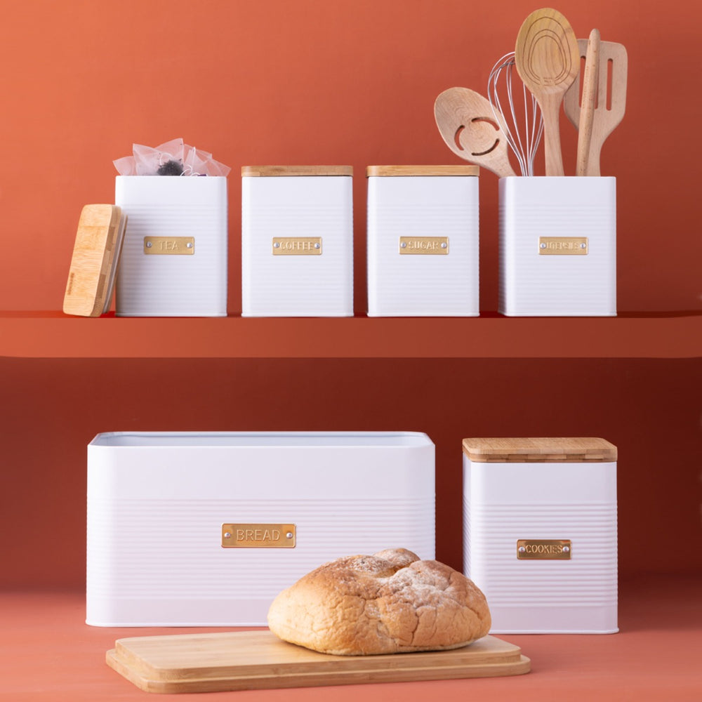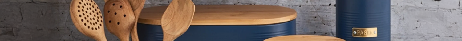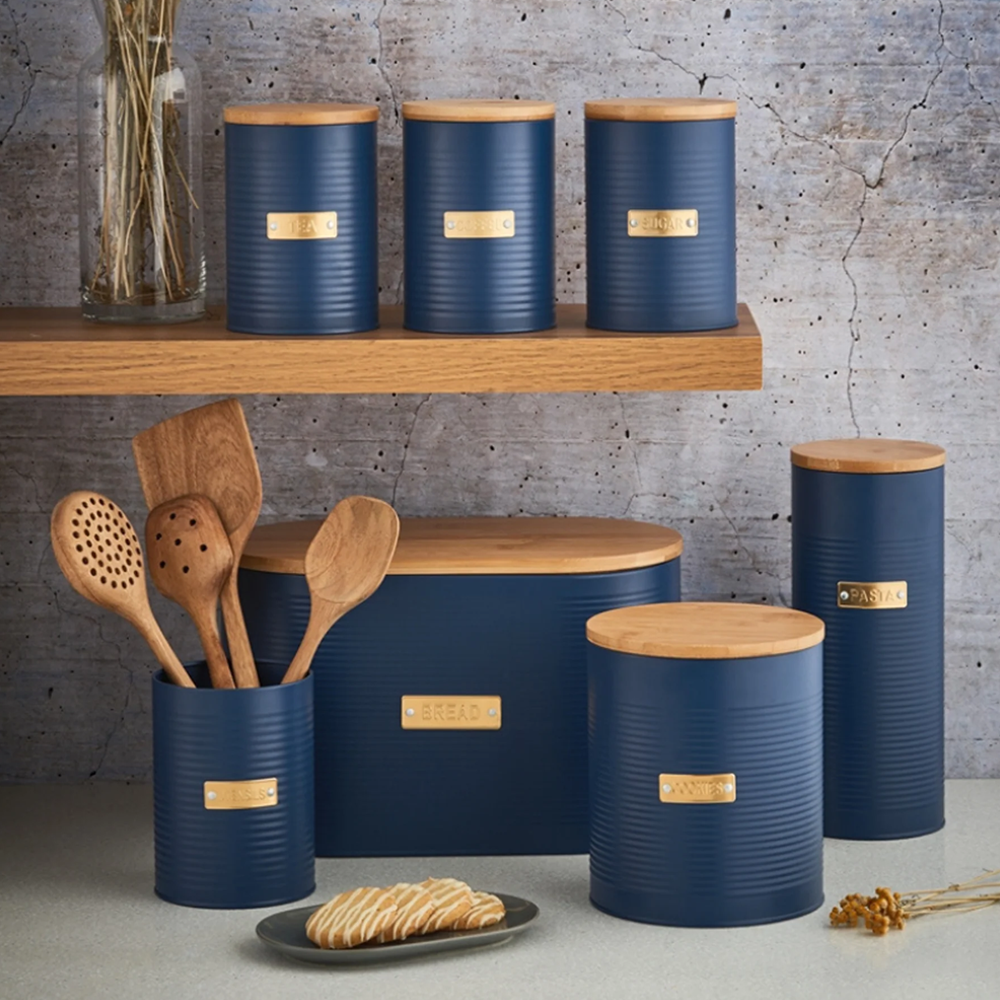 Bring sleek sophistication to countertop storage with matte black and navy steel canisters, stylish utensil pots, bread bins, and caddies. Featuring sustainable bamboo lids and airtight seals inlaid with gold accents, this range combines elegance with practicality.