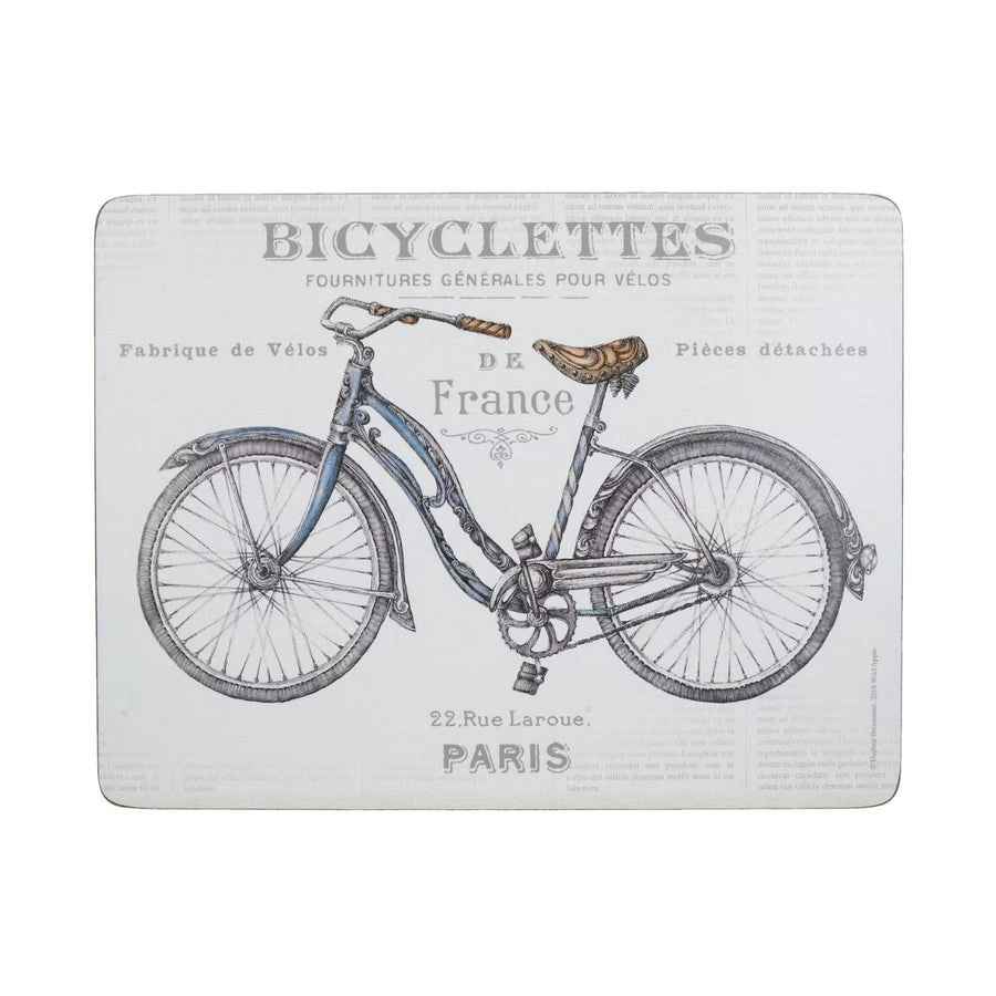 Be transported to the quaint beauty of France within your home with this stylish design from Creative Tops. Featuring a steampunk-inspired bicycle and French text, this set of six placemats are ideal for use in your kitchen or dining room, and have a lacquered finish with a cork backing which is heat resistant to 120 degrees.