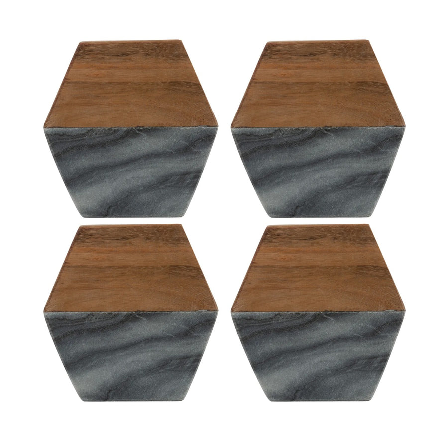 Add sophistication and style to your coffee table with this set of stunning coasters! Perfect for protecting your furniture and countertops, these durable coasters are crafted from a shiny black/grey marble and acacia wood. The sparkle in the marble, contrasting with the grain and brown shades within the acacia wood offer a lovely two-tone effect while providing a heat-resistant surface for any hot cups of teas or mugs of coffee. Each coaster features non-slip feet, meaning they will stay in place while in use. They are also easy to clean by simply wiping with a warm, damp cloth.