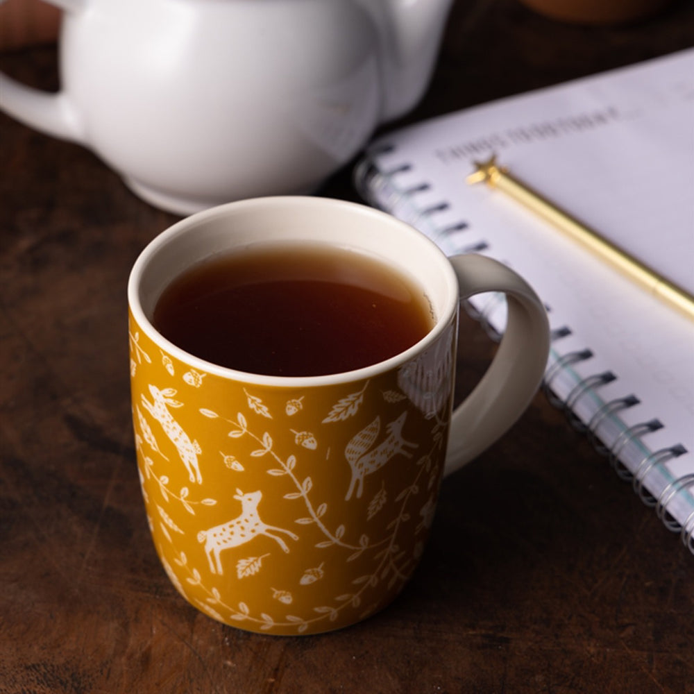 Bring some delightful charm to your teatime with this lovely china mug! Featuring a woodland inspired print on a warming mustard background, this sturdy mug has a 340ml capacity and is dishwasher & microwave safe - perfect for everyday use or special occasions.