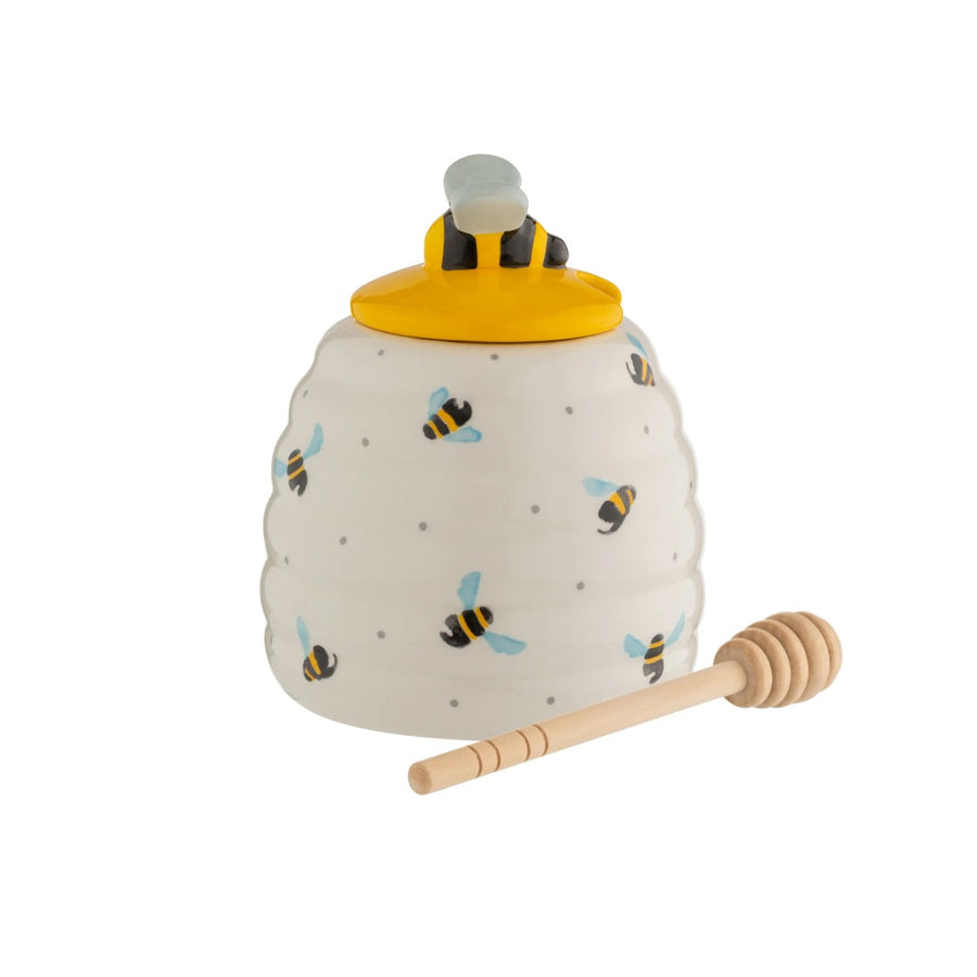 Sugar storage jar in the shaped of a beehive, with flying bee print