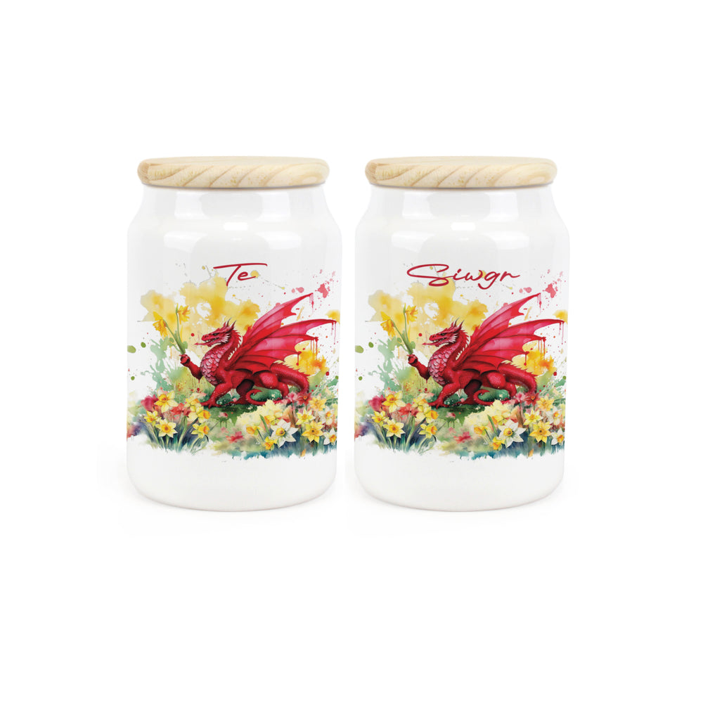 Showcasing the national yellow flower and the patriotic red dragon of Wales, this stunning set of ceramic storage canisters explode with colour! Titled with Welsh text marking the contents, these airtight containers display the recognisable dragon surrounded by splashes of yellow, red and green, with a bed of daffodils blooming beneath - ideal for storing your hot drinks essentials.