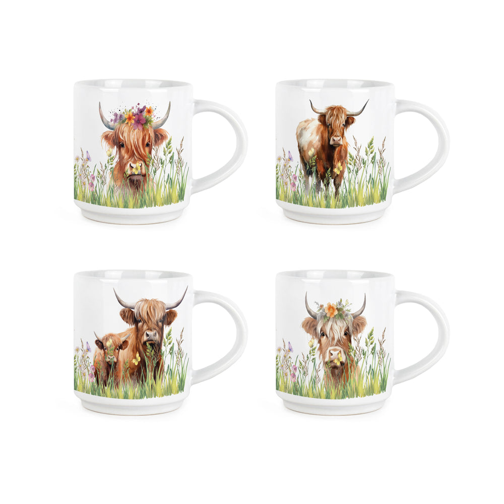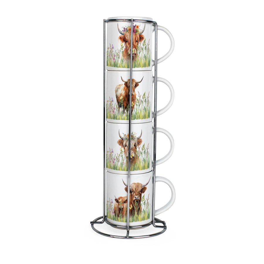Are you an animal lover? This set of ceramic stacking mugs feature four adorable highland cow designs - surrounded by flowers & butterflies. A lovely housewarming gift for friends & family, or for adding a touch of countryside charm to your own kitchen countertop! Provided as a set of four with a metal stand, to keep the mugs on display.