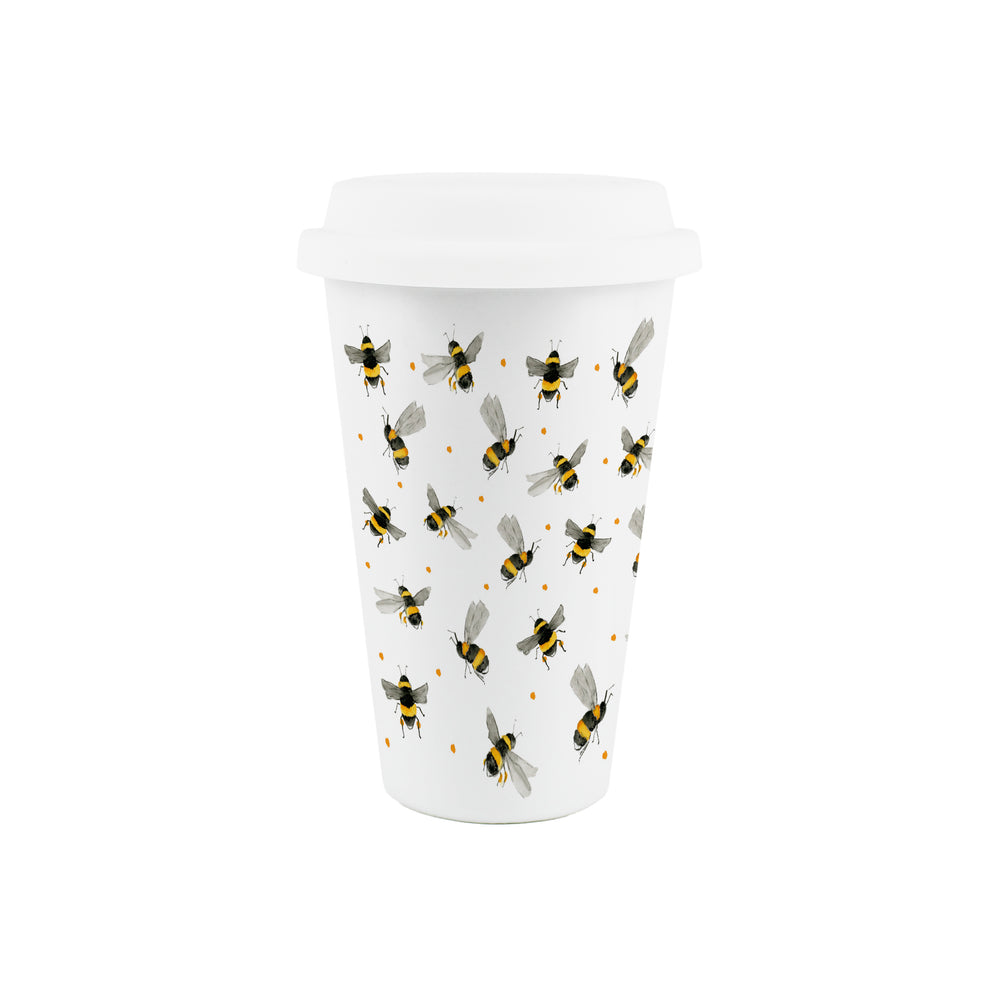 A stunning gift for bee lovers! This ceramic travel mug features a pretty scattered black & yellow bee pattern, designed by artist Rhiannon Chauncey. Ideal for enjoying a hot drink when out and about in nature!