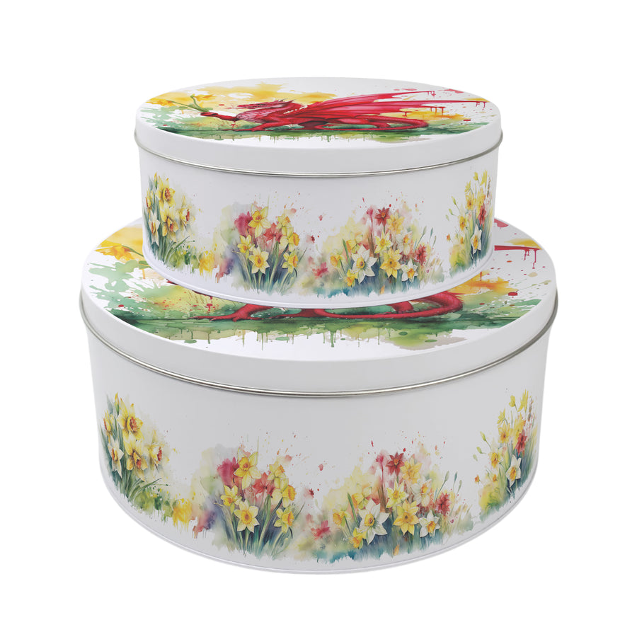 Displaying the national flower and the patriotic red dragon of Wales, this set of stunning round cake tins explodes with colour! The lids feature the recognisable dragon surrounded by splashes of yellow, red and green, with a bed of daffodils blooming beneath - ideal for your Welsh adventures! Each tin is also available individually.
